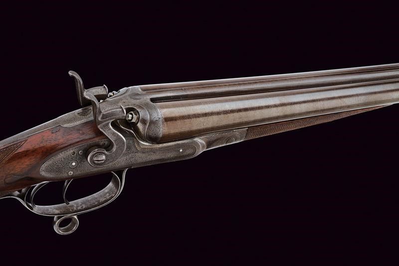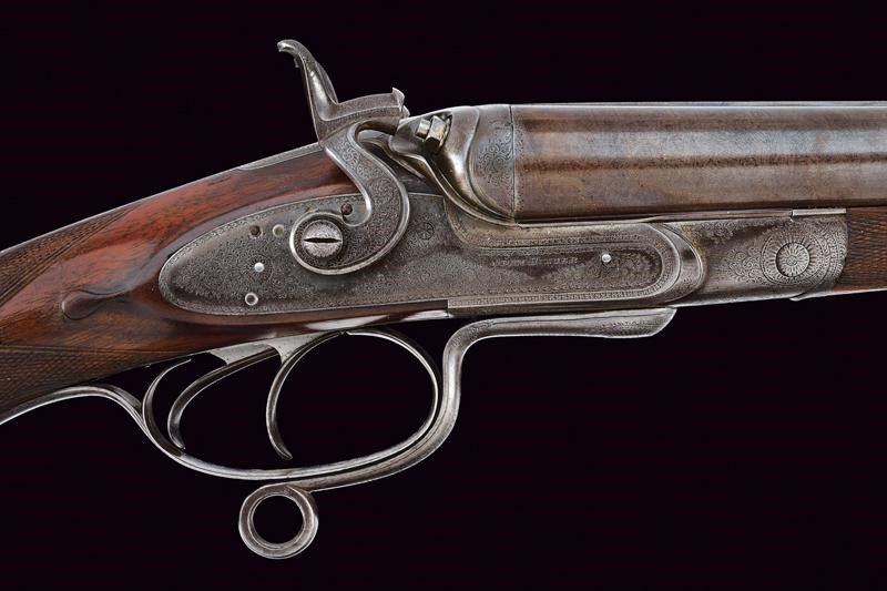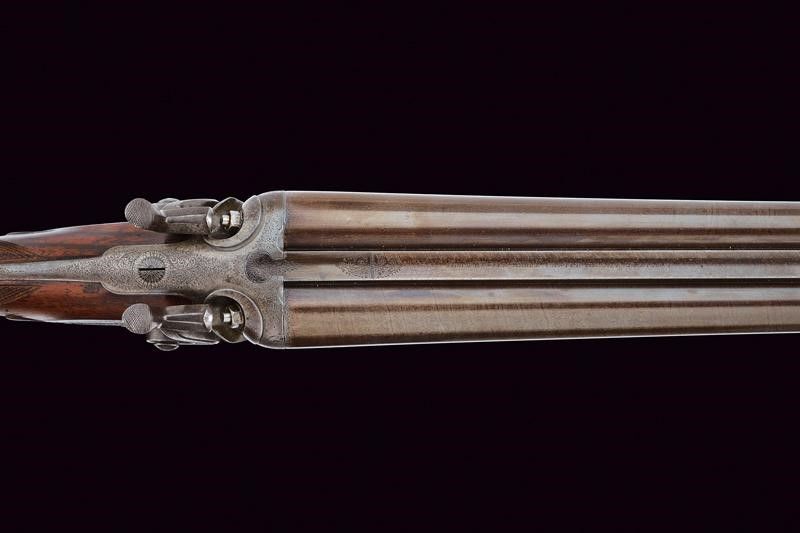 Canne tonde, lisce (anime pulite), damascate, con bindella firmata 'ADAM HUNTER MAKER CASTLE ARCADE BELFAST', incisa alla base e con mirino, cal. 12. Codetta finemente incisa a motivi floreali; batterie a molla in avanti firmate 'ADAM HUNTER' e decorate en suite come anche tutti fornimenti. Calcio e astina in radica con zigrinature. Leva d'apertura sotto al ponticello. Matricola '1xx'. Di buona qualità.
