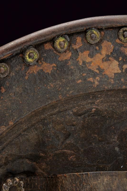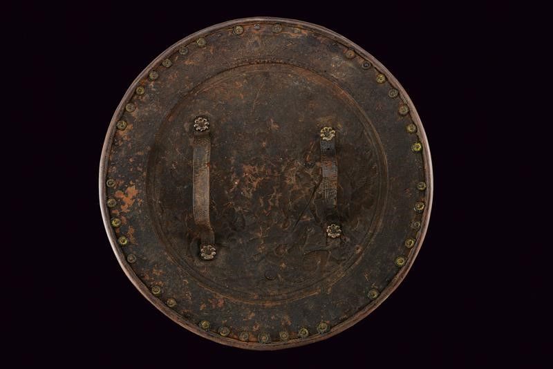 Italia settentrionale, diametro 56 cm. 1620 circa In ferro, di forma circolare e convesso, con bordo rilevato e lavorato a fingere il tortiglione. Maestosamente sbalzato ed inciso in rilievo con una scena di battaglia in primo piano con guerrieri a cavallo ai piedi di una collina, questa sormontata da una roccaforte, nel cielo il sole e le nuvole. Bella esecuzione di armi ed armature. Il bordo ribassato e completamente decorato con ghirlande e motivi floreali. Giro di ribattini con resti di coietti sul retro. Il lato posteriore con due maniglie in cuoio fissate con rosette in ottone.
