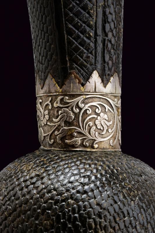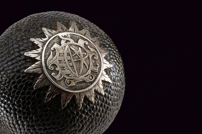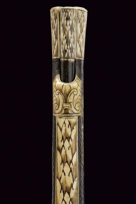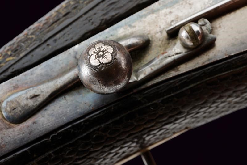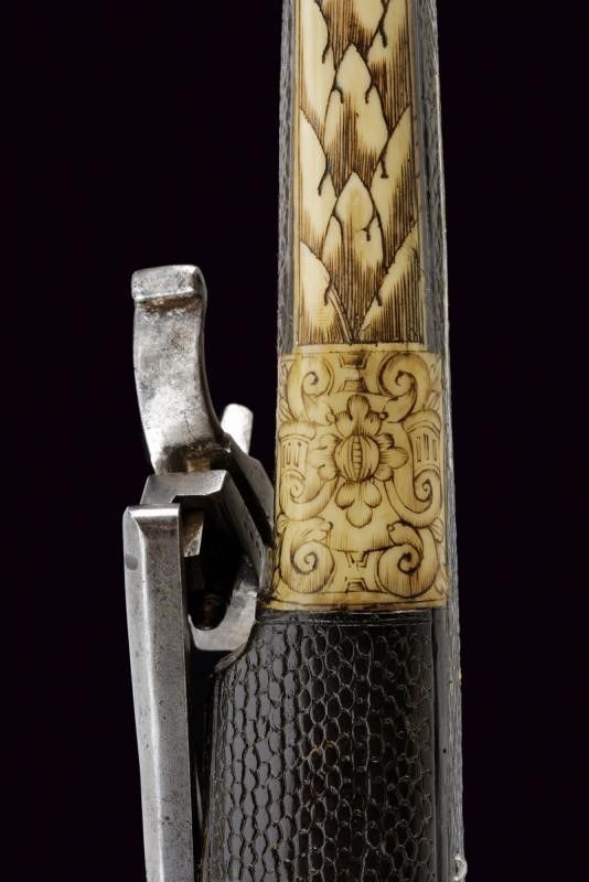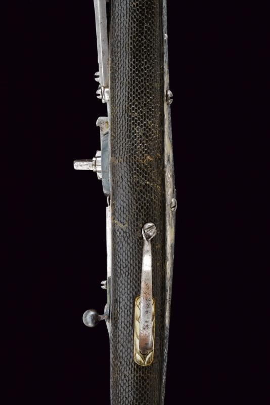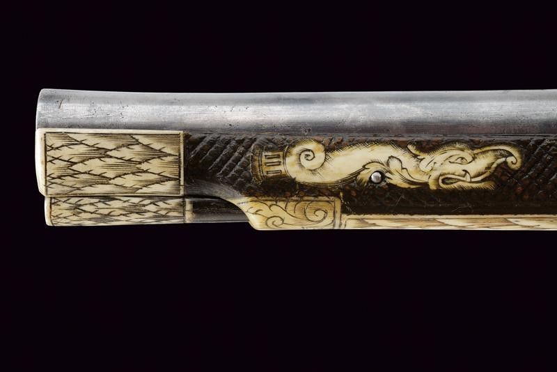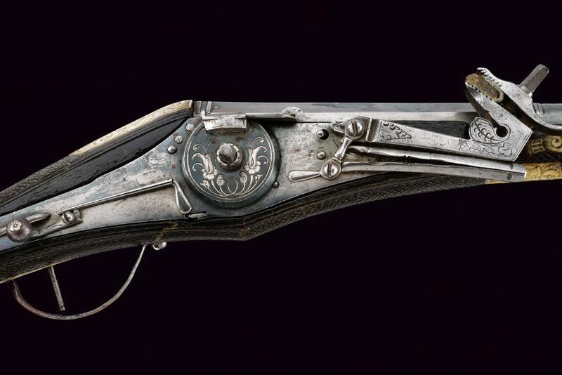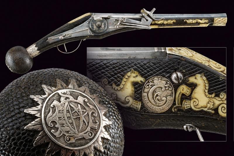 Canna liscia a due ordini, inizialmente ottagonale, con cornici in argento, poi con due anellature al cambio e infine tonda, recante resti di doratura originale, cal. 12 mm. Codetta liscia angolata. Batteria a ruota esterna coperta ed incisa a motivi floreali in argento su fondo brunito; cartella con lievi resti di brunitura, il cane inciso a motivi floreali, la leva della sicura decorata con un fiore in argento. Cassa intera in legno simile ai puffer da truppa, con belle tarsie in osso raffiguranti animali mitologici e con disegni floreali. Ponticello in ferro. Il pomo recante alla base una ghiera in argento incisa a motivi floreali in bassorilievo, al dorso lo stemma sassone caricato su una piastra raggiata. La contropiastra munita di un medaglione in argento recante la lettera 'C' sormontata dalla corona di Elettore e bordata in basso da un cartiglio con motto in latino 'FIDE SED CUI VIDE' (Fidati, ma stai attento di chi [ti fidi]). Completo di bacchetta con battipalla in corno inciso e base in ferro. Bellissima arma di grande qualità .