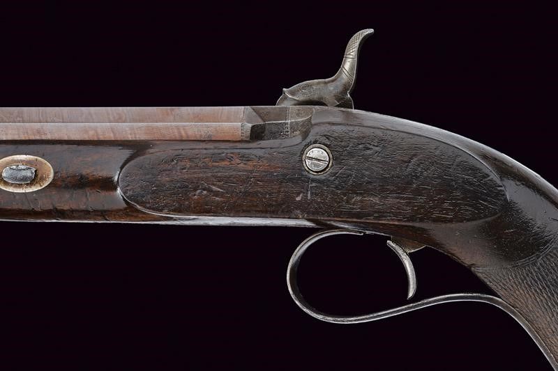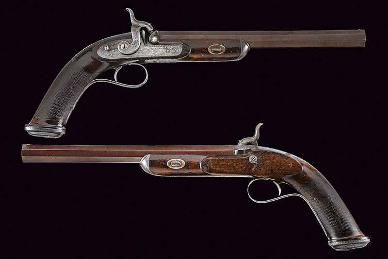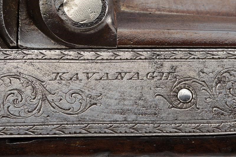 Lunghe canne ottagonali, lisce, damascate e brunite, marcate 'DUBLIN', con duplice cornice leggermente incisa e con conchiglia alla culatta, nella parte inferiore recanti punzoni del banco di prova di Londra, cal. 13 mm. Codette finemente incise a motivi floreali e con conchiglia. Belle batterie a luminello a molla in avanti, cartelle firmate 'KAVANAGH' e incise a motivi floreali, fini incisioni ai bordi che trasmettono un senso di continuità , codoli con sicura. Mezze casse in legno (piccoli difetti), interessanti calci obliqui zigrinati. Fornimenti in ferro incisi en suite. Sui dorsi scudetto rettangolare in argento. Grilletti con sensibilizzatore. Meccanica funzionate.