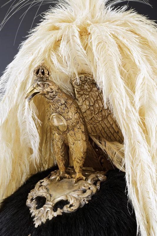 Regno d'Italia, altezza 30 cm. 1870 circa Coppo rivestito di pelliccia nera di foca vitulina, cimiero dorato messo a giorno su una base in argento sbalzata a fiorame recante i bolli dell'argentiere, aquila coronata in argento a tutto tondo. Raggiera in argento con piccola stella centrale dorata caricata con il tipico monogramma VE coronato (Re Vittorio Emanuele II, 1861-1878). Sottogola in argento a squame con rosoni lobati e coccarda tricolore in filo d'argento. Bell' interno con visiere in marocchino verde, alluda in cuoio marrone in parte plissettato recante impresso in oro il marchio del fabbricante londinese. Cuffie in seta blu. Pennacchio originale completo di pennacchiera dorata.