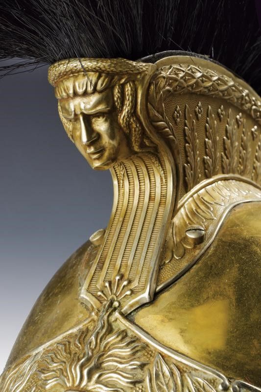 Francia, altezza circa 24 cm. Prima metà del XX Secolo Coppo in metallo color ottone con fornimenti in metallo bianco. Cimiero e coda in crine nero (mancanze). Soggoli in cuoio corazzati con scaglie in metallo e con grandi orecchioni lavorati a testa di leone. Interno con segni d'uso e del tempo. Cuffia in cuoio nero. Epoca Terza Repubblica.