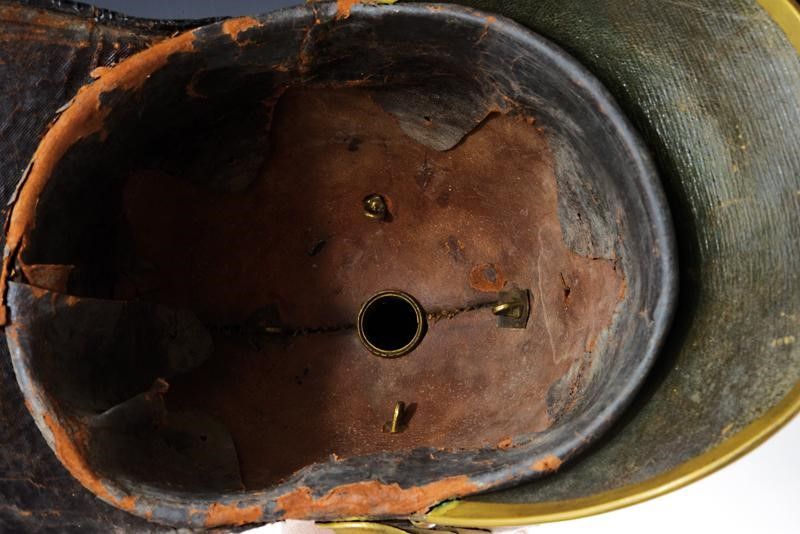 Svezia, altezza 36 cm. Metà del XIX Secolo Alto corpo in cuoio laccato di nero, cuspide liscia su base a croce, fregio anteriore svedese con tre corone su fondo smaltato di color blu. Soggolo a squame e coccarda sul lato destro. All'interno alluda in pelle (segni d'uso e del tempo). Molto raro.
