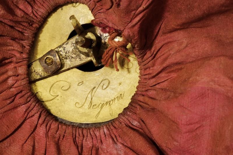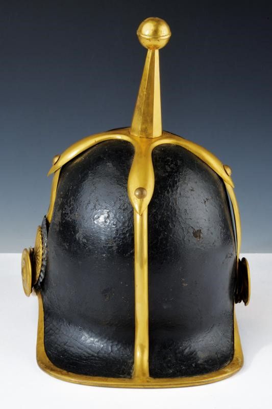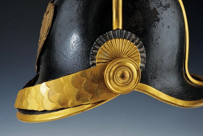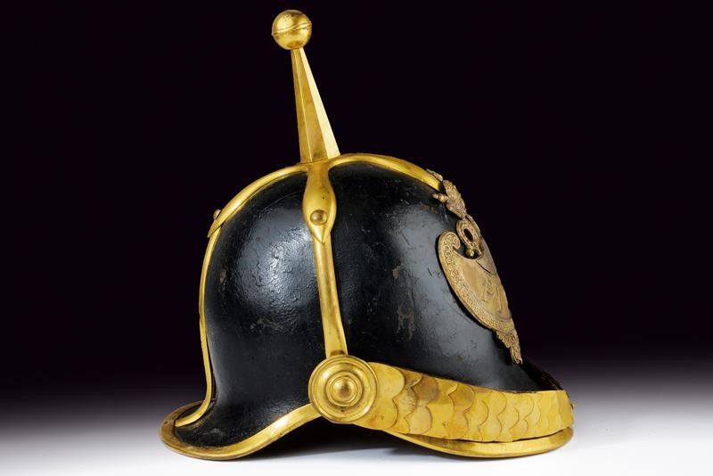 Stato Pontificio, altezza 30 cm. Seconda metà del XIX Secolo Coppo in cuoio nero con fornimenti dorati, fregio frontale con tiara papale, iscrizione 'Pio IX' e lunetta argentata con numero 7 messo a giorno. Soggolo a squame e coccarda metallica in due parti oro e argento. Interno con dischetto in ottone recante inciso in corsivo il nome del fabbricante: 'G. Negroni fece Bologna'. Interno delle visiere in marocchino verde, alluda rossa con cuffia sempre in seta rossa. Piccole tracce d' uso.