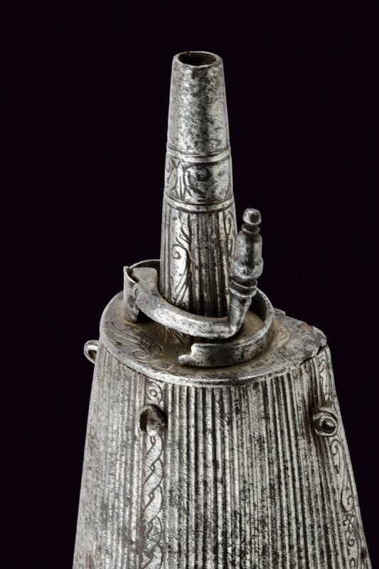 Brescia, altezza 19 cm. Corpo di forma troncoconica e piatto sul retro, decorato a scanalature longitudinali a mille righe con tre doghe incise a motivi floreali sulla faccia anteriore. La faccia del cannello incisa en suite con le doghe. La base del cannello troncoconica, lavorata come il serbatoio. Chiusura a vite con cerniera. Quattro anelli di sospensione.