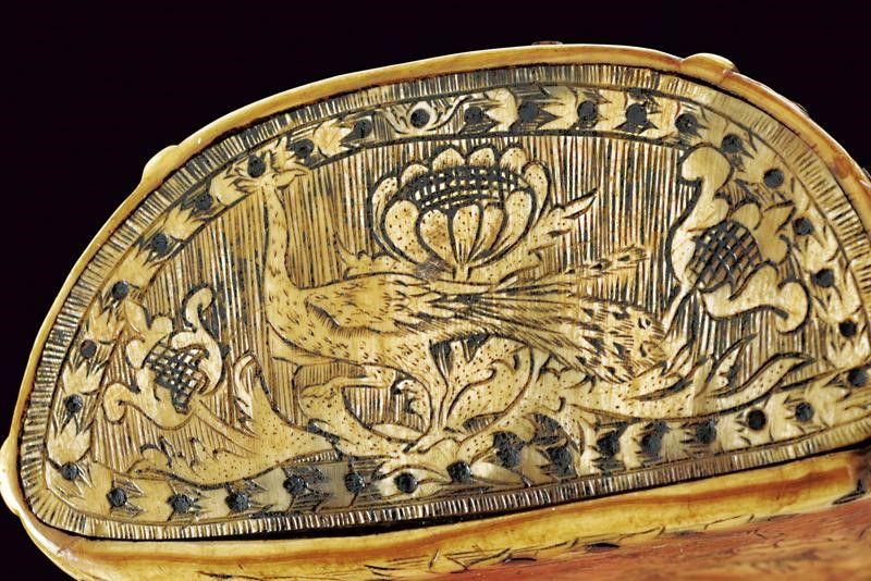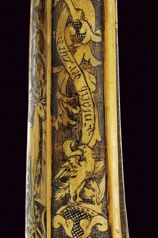 Germania, altezza 17,5 cm. Corpo con faccia posteriore piatta, sul lato anteriore un semicerchio diviso in tre segmenti da doghe longitudinali. La parte piana recante una bellissima incisione di un cacciatore con i suoi cani che suona il corno, sormontato da un grande cartiglio con iscrizione a tema venatorio; sul lato convesso un grande cervo nel bosco, affiancato da aquile con cartigli recanti motti di caccia; in alto sopra al cervo un uccello, alle estremità cornici floreali. Sul fondo effige di un pavone circondato da fiori. Cannello tondo in corno scuro. Piccole mancanze.