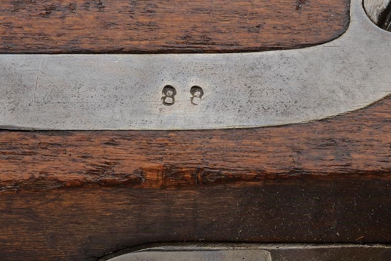 Austria, lunghezza 133 cm. Canna rigata (anima con pitting, rigatura visibile), tonda, con base ottagonale marcata 'H', alzo abbattibile marcato 'LW 8', mirino, cal. 14 mm. Batteria a molla in avanti con cartella piatta. Cassa intera in legno con fornimenti in ferro (marcati '88'), bacchetta e baionetta in ferro.