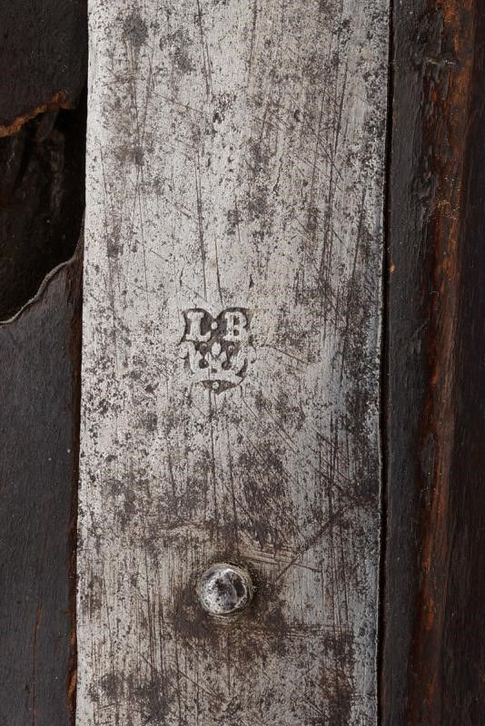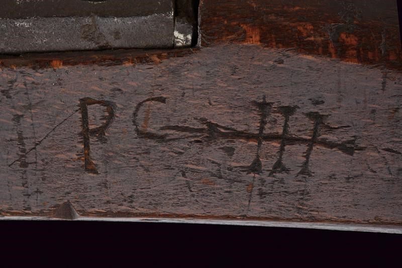 Canna ottagonale liscia, con base recante un profondo punzone 'M', piccolo alzo e mirino, cal. 17 mm. Sul lato destro scodellino con parascintille, batteria a miccia con cartella rettangolare marcata con punzone 'LB' al centro, e decorata con due linee verticali, meccanica funzionante. Cassa intera in legno con calcio faccettato e marcato con vari simboli e lettere. Grilletto in ferro. Bacchetta in ferro, non pertinente. Diverse mancanze e difetti alla cassa.