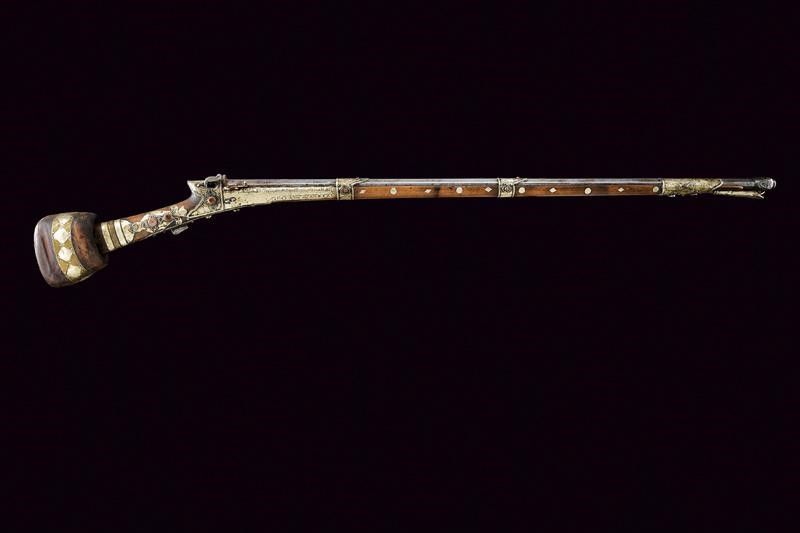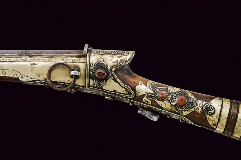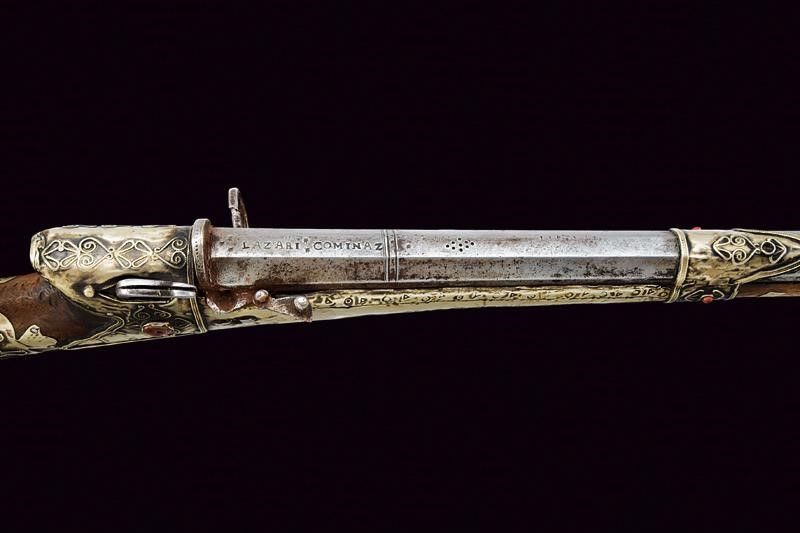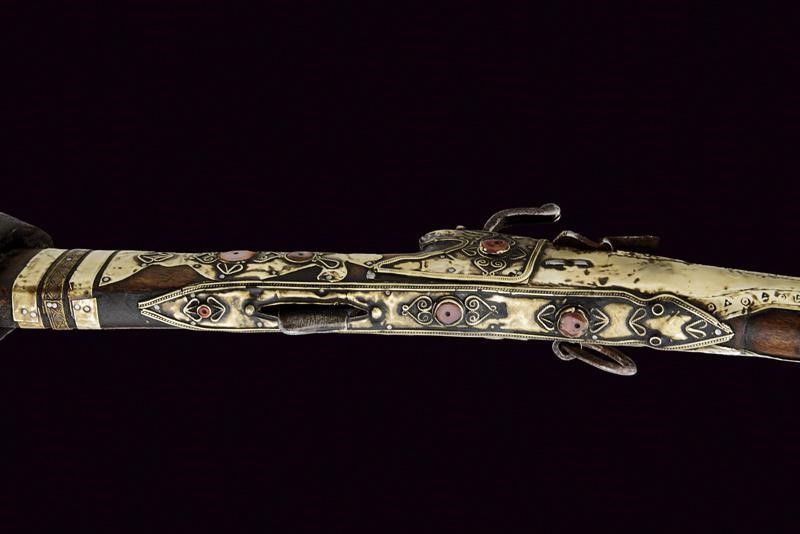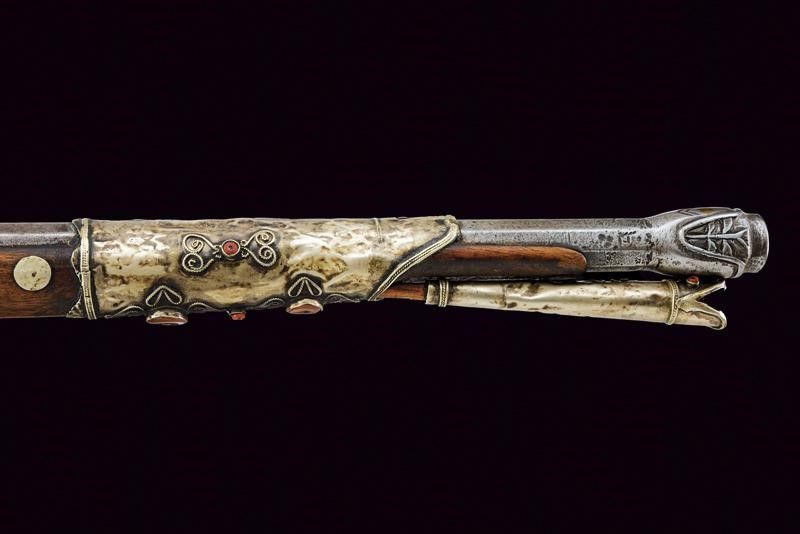 Yemen, lunghezza 150,5 cm. XIX Secolo Canna in ferro, ottagonale, marcata al dorso 'LAZARI COMINAZ' fra stelle, munita in culatta di alzo circolare privo di tacca di mira, in volata recante gioia di bocca intagliata a testa di mostro, con occhi in ottone, cal. 14 mm. Piccolo scodellino dotato di copriscodellino girevole. Meccanica con serpentina funzionante. Cassa intera in legno parzialmente rivestita con lamine in metallo bianco decorate in vari punti con volute in filigrana e con cabochon in pietra color rosso sul tipo della corniola. grilletto in ferro. Calcio di tipica forma. Testa della bacchetta con decoro simile alla volata della canna. Arabia del sud o India.
