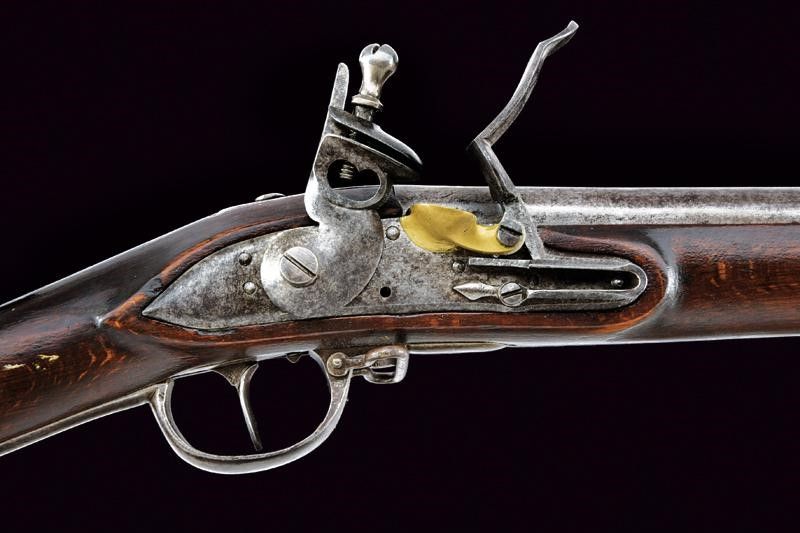 Austria, lunghezza 150 cm. Inizio del XIX Secolo Canna liscia tonda, con base leggermente squadrata ai lati, recante il punzone imperiale, il mirino sul reggicanna, cal. 17 mm. Batteria a pietra focaia, cane e scodellino di restauro. Cassa intera in legno con fornimenti e bacchetta in ferro. Con baionetta a manicotto dotata di lama cruciforme (lung. 56 cm) e munita di fodero in legno ricoperto di cuoio con fornimenti in metallo.