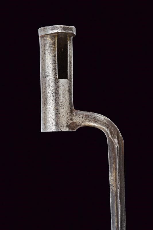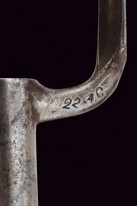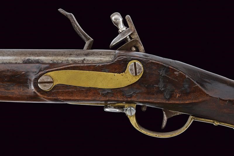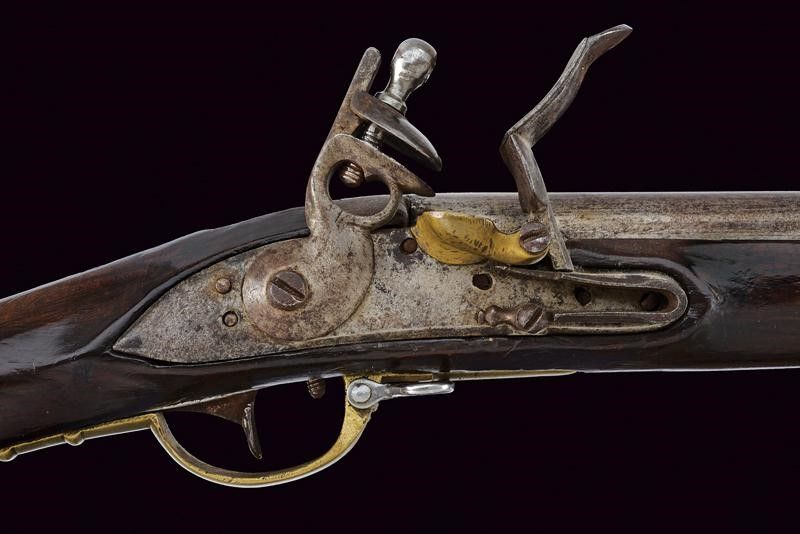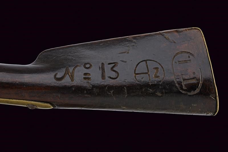 Inizio del XIX Secolo Canna liscia tonda, con base leggermente squadrata ai lati, recante un punzone, attacco per la baionetta, mirino sul reggicanna, cal. 17.7 mm. Batteria con cartella liscia, scodellino in ottone. Cassa intera in legno (difetti e mancanze), il calcio marcato su un lato 'N 13', 'T.I' e sull'altro 'I. B. ..'. Fornimenti in ottone e bacchetta in ferro. Con baionetta a manicotto dotata di lama cruciforme (lung. 56 cm).