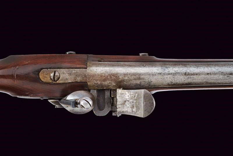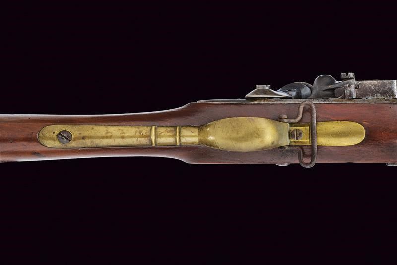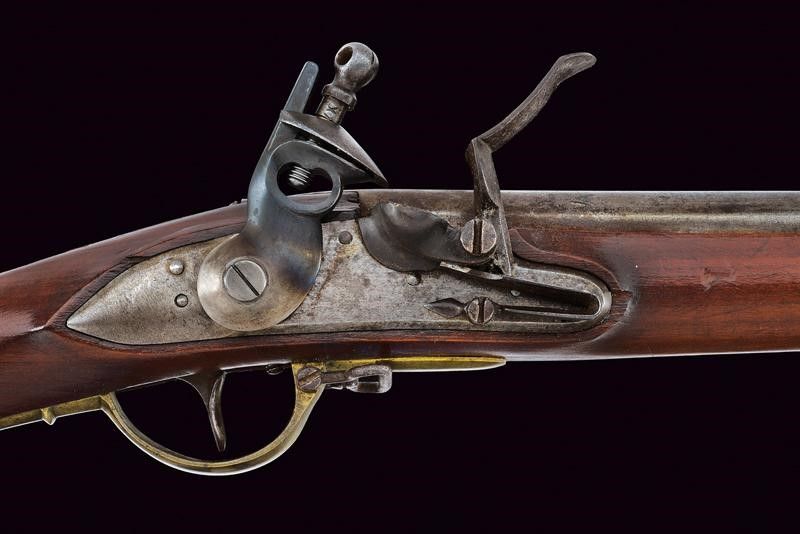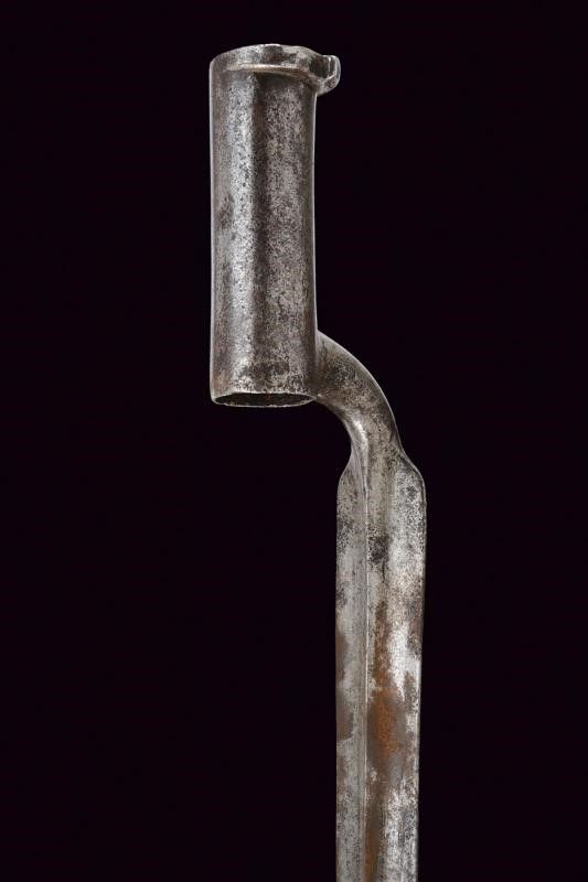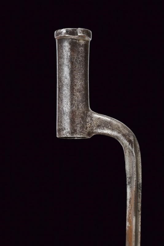 Austria, lunghezza 150 cm. Inizio del XIX Secolo Canna liscia tonda, con base leggermente squadrata ai lati, recante un punzone, il mirino sul reggicanna, cal. 17 mm. Batteria a pietra focaia, cane e scodellino di restauro. Cassa intera in legno con fornimenti in ottone e bacchetta in ferro. Con baionetta a manicotto dotata di lama cruciforme (lung. 55 cm) con fodero in ferro ricoperto di cuoio.