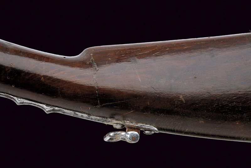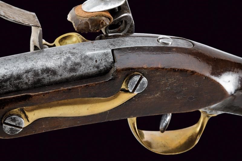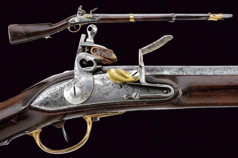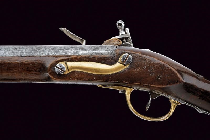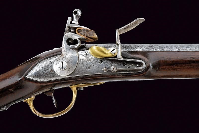 Stato Pontificio, lunghezza 118,3 cm. Canna tonda liscia con culatta ottagonale recante lievi tracce di punzoni, dotata di dente d'innesto per baionetta alla base (segni di saldatura in ottone), cal. 17,4 mm. in volata. Batteria a pietra con scodellino in ottone e cartella marcata 'GM' (Per Gaetano Mazzocchi). Meccanica funzionante. Cassa intera in legno con danni e restauri. Ponticello in ferro e ottone, calciolo in ottone. Fascette in ferro e ottone. Bocchino in ottone (patina leggermente differente rispetto agli altri componenti in ottone) con mirino. Sottile bacchetta in ferro. Sul tipo del fucile da Volteggiatori ma più corto.