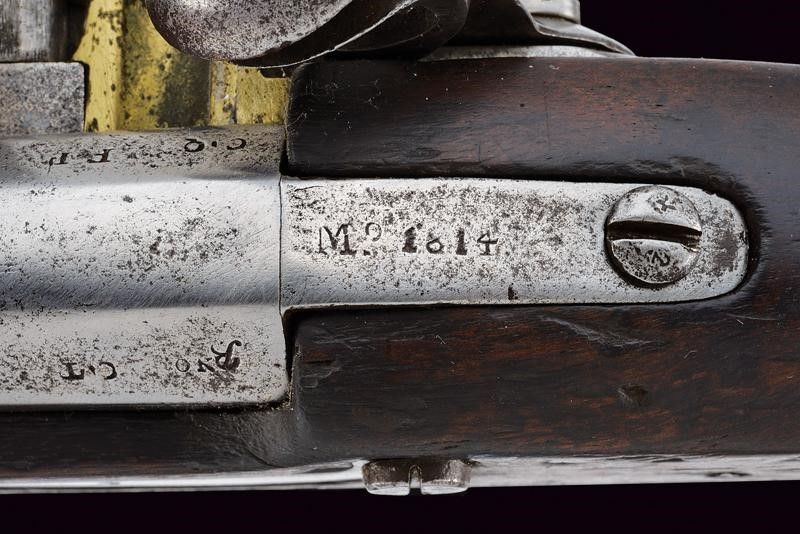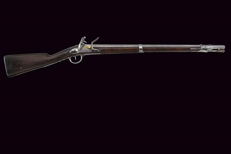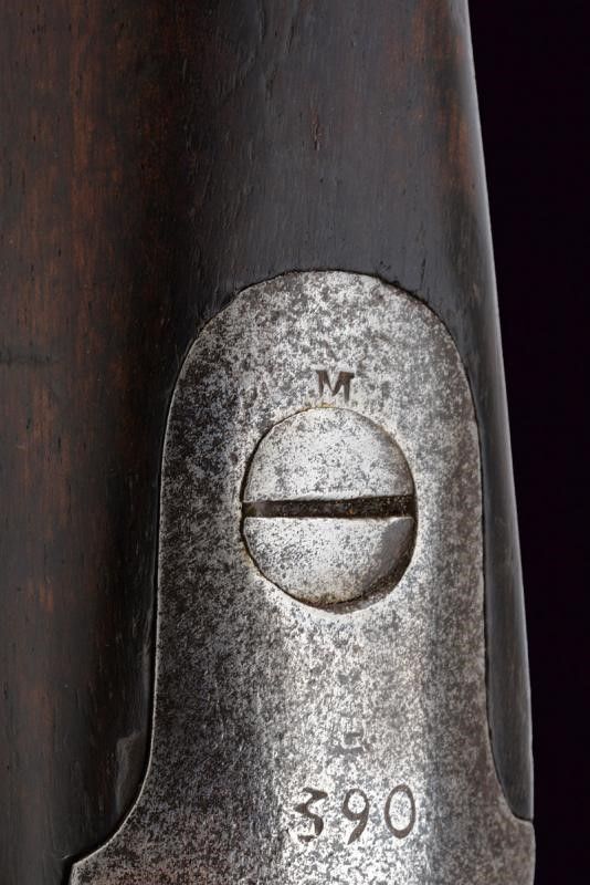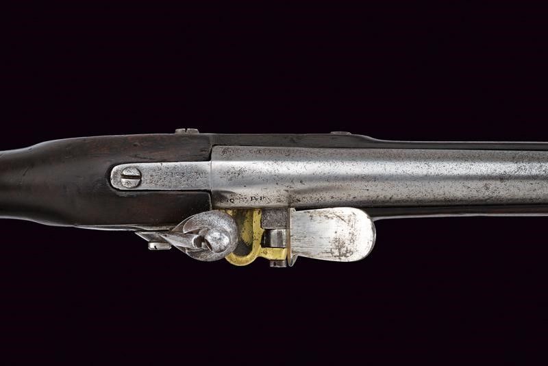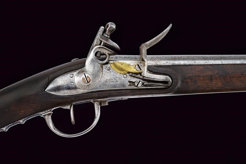 Torino, lunghezza 108.5 cm. Canna tonda liscia con culatta ottagonale marcata 'R.NO', 'C.T', 'C.Q' e 'P...', munita di dente d'innesto per la baionetta, cal. 17 mm. Codetta liscia recante la marcatura del modello. Batteria a pietra focaia con cartella liscia marcata 'FABB.A R.A / IN TORINO', scodellino in ottone. Cassa intera in legno (difetti) marcata nella parte inferiore della pala 'A. STUARDI' e con timbro poco leggibile su una guancia. Fornimenti e bacchetta in ferro. Punzoni e numero sul calciolo.