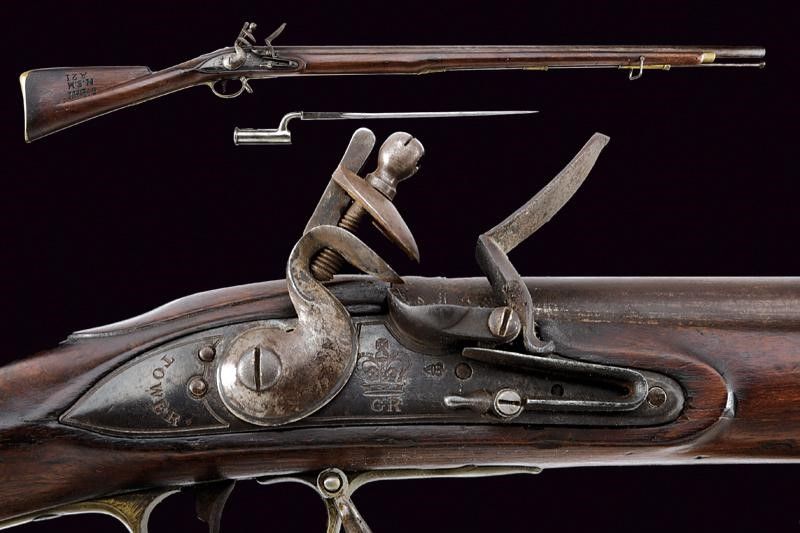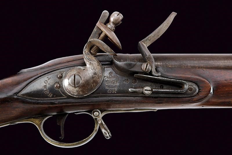 Inghilterra, lunghezza 139 cm. Canna liscia tonda, con culatta munita di cornice tonda e punzoni del banco di prova (GR sotto corona), dotata di mirino (che funge anche da attacco per la baionetta), cal. 18 mm; codetta con punzone '9' sotto corona. Batteria a pietra focaia marcata con 'GR' coronato, 'TOWER' e con broad arrow. I bordi del cane con doppie linee. Cassa intera in legno (crepa davanti al ponticello), il calcio marcato '6 BATT.N / N.S.M / A 2I'. Fornimenti lisci in ottone. Bacchetta e baionetta a ghiera in ferro (lunghezza 56 cm).