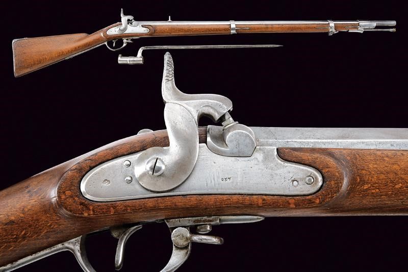 Austria, lunghezza 133 cm. Canna tonda rigata (anima pulita, rigatura visibile), dotata di mirino, con alzo fisso, base ottagonale marcata 'CARL HEISLER', 'W' sotto punzone imperiale e due altri punzoni. Cal. 13.9 mm. Batteria datata'857' e con punzone imperiale. Meccanica funzionante. Cassa intera in legno recante un timbro sotto alla pala. Fornimenti in ferro con vari punzoni. Bacchetta in ferro con banda in ottone. Baionetta a ghiera con lama cruciforme, lunghezza 56 [cm].