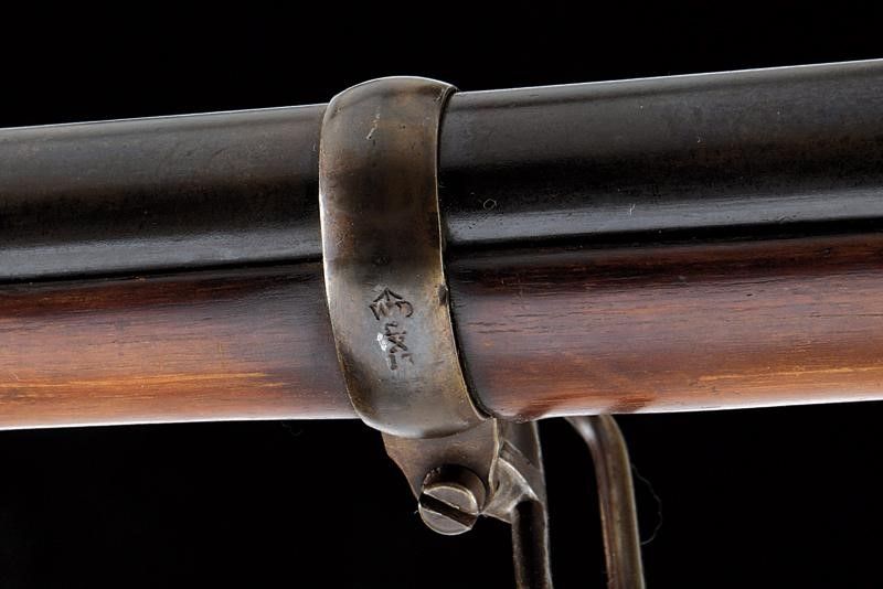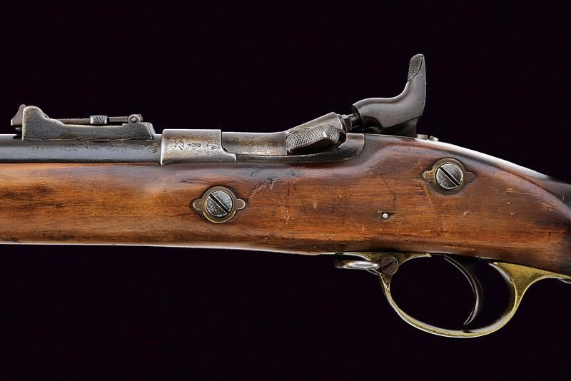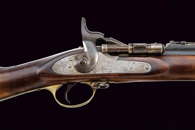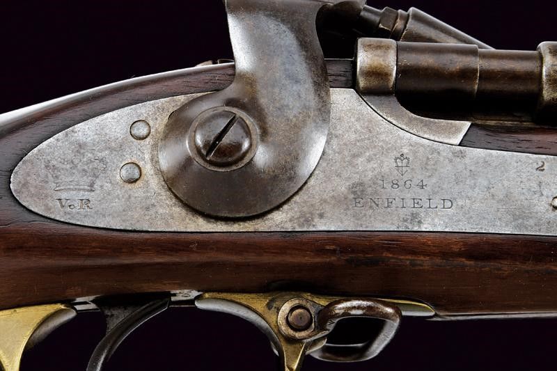Canna tonda rigata (anima pulita, rigatura ben visibile), recante alla base punzoni britannici e 'Steel', con alzo abbattibile e regolabile, mirino, cal. 14 mm. Tipico otturatore a tabacchiera marcato 'WD' e con punzoni, meccanica funzionante. Batteria a molla in avanti datata '1864', marcata 'ENFIELD', 'VR' sotto corona e con punzoni. Cassa intera in legno. Fornimenti in ottone. Bacchetta in ferro.