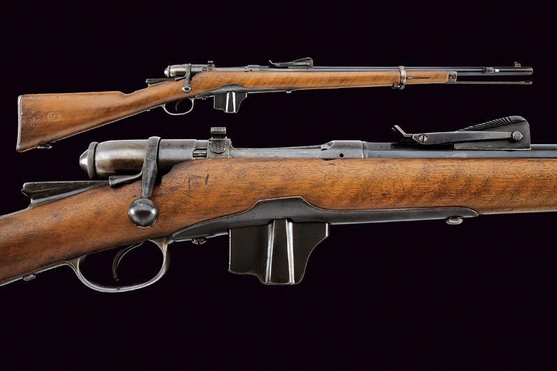 Canna tonda, rigata (anima pulita, rigatura ben visibile) con base ottagonale, marcata 'BRESCIA', '1874', 'BD' e con numero di matricola 'A 5xx', alzo regolabile, guida d'innesto per baionetta, mirino, cal. 10,4 mm. Otturatore girevole-scorrevole funzionante, senza copertura. Cassa intera in legno, il calcio marcato con numero di matricola coevo e con timbro di 'F.A D'ARMI TORINO RIPARAZ.E 1886'. Fornimenti e bacchetta in ferro. Caricatore con verniciatura nera.
