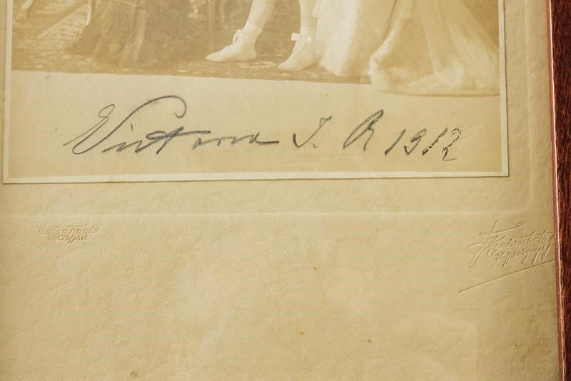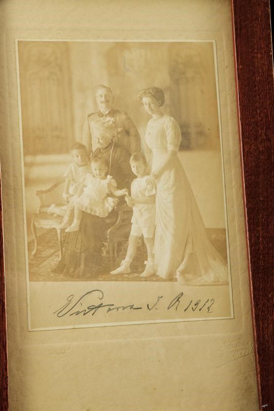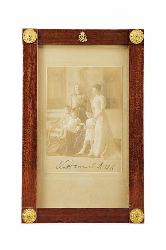 Berlino, dimensioni 23.5 x 38.2 cm. 1912 Bella fotografia ritraente il Kaiser con la sua consorte Augusta Vittoria e la loro figlia Vittoria Luisa, insieme con tre nipoti. Firmata e datata in basso 'Vittoria J. R 1912', con timbri dei fotografi di corte. In elegante cornice in legno recante il monogramma del Kaiser e quattro rosette ai vertici. Sotto vetro.