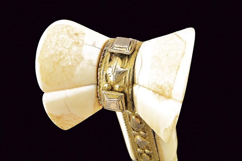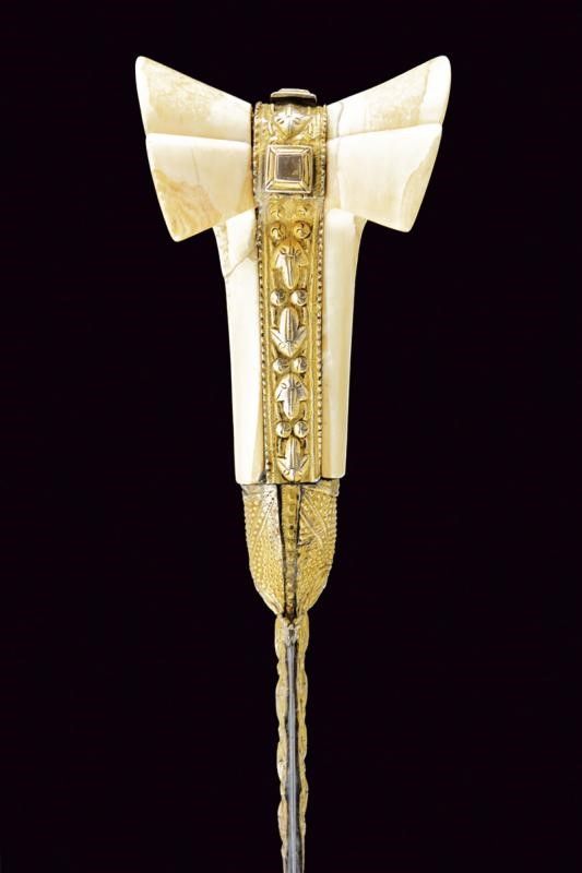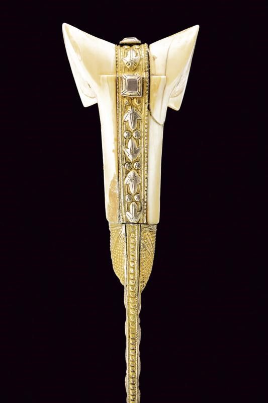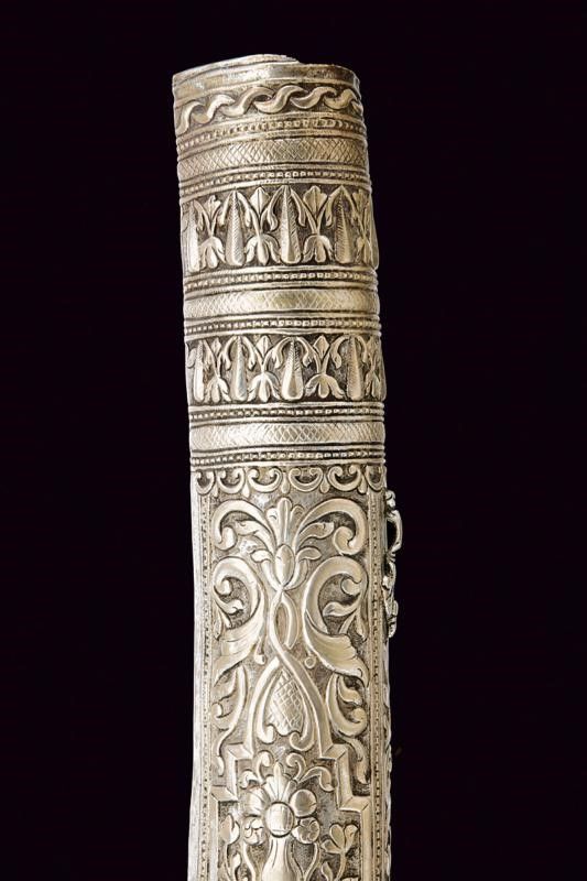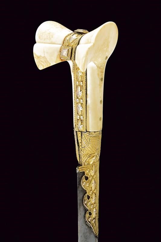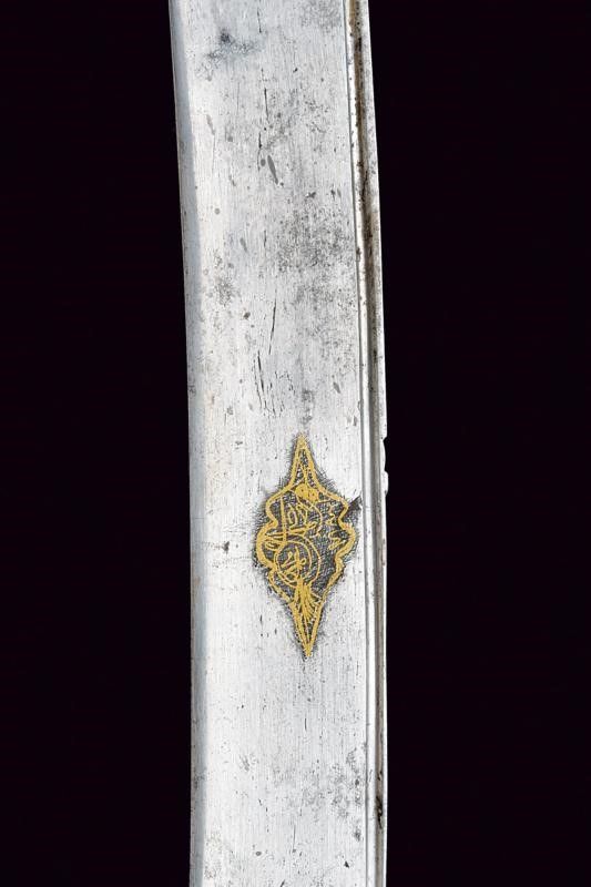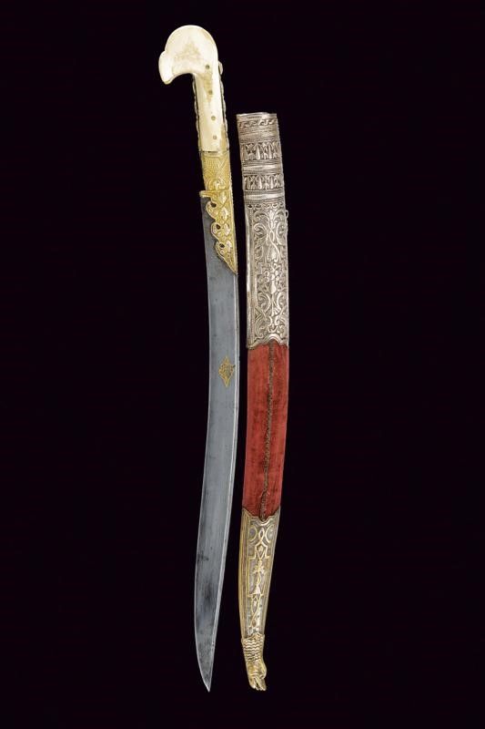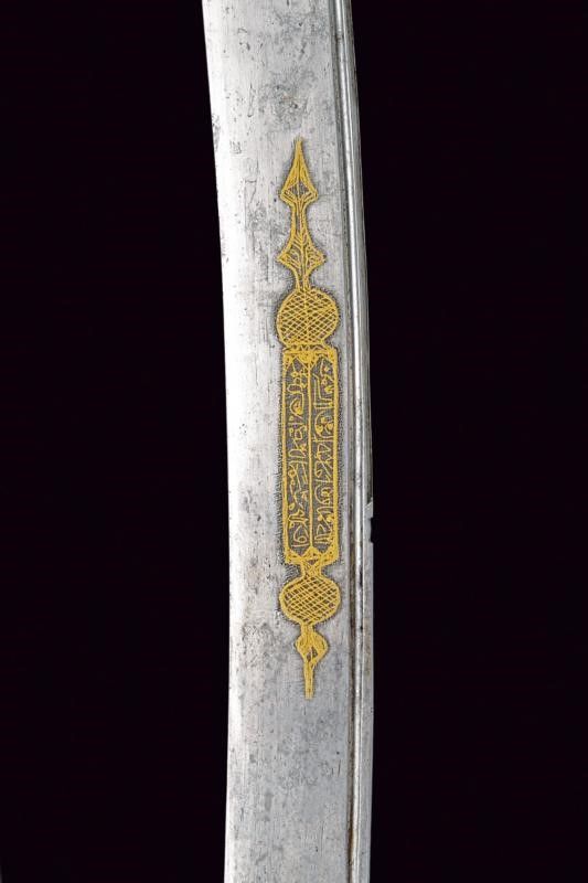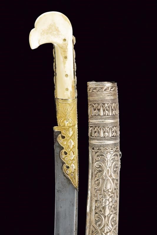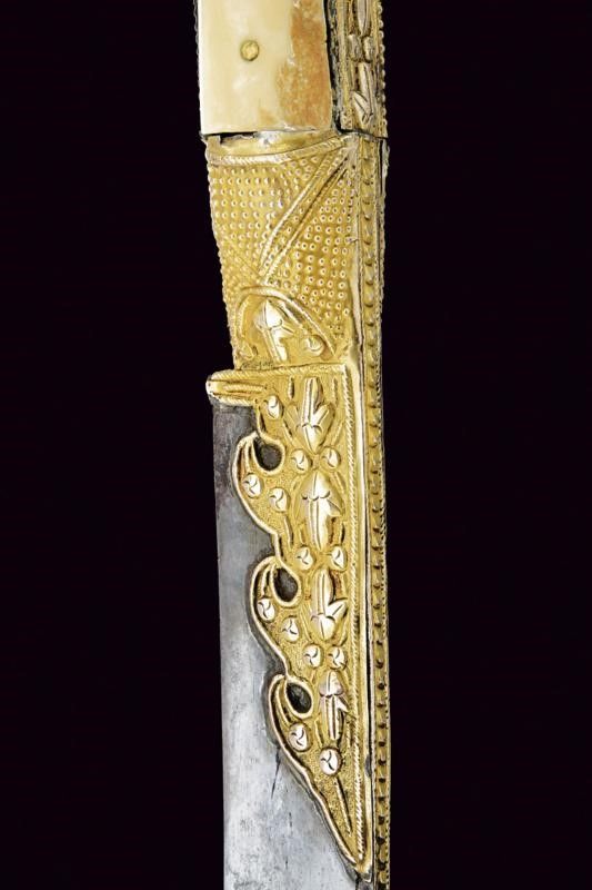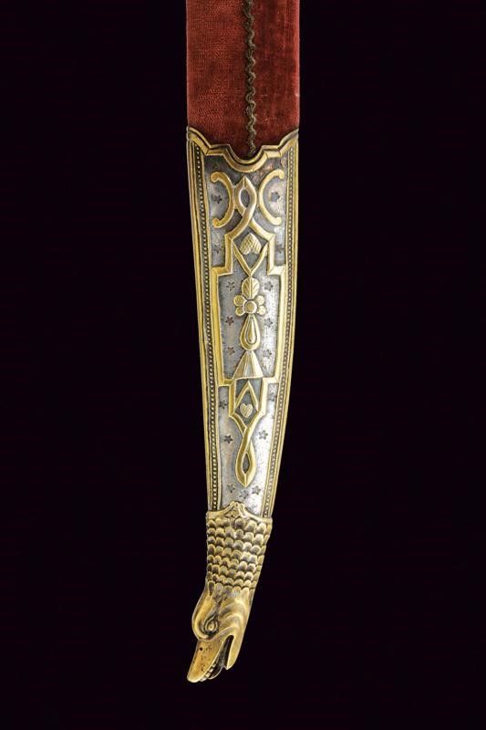 Turchia, lunghezza 72 cm. XIX Secolo Lunga lama curva a un filo, con scanalatura dorsale e dorso nervato, al centro su entrambi i lati un cartiglio rimesso in oro con iscrizioni in arabo e decorazione geometriche. Fornimento in argento dorato e sbalzato a motivi floreali e geometrici. Grandi guancette in zanna di tricheco con restauri. Fodero in legno rivestito di velluto bordeaux (parzialmente liso) con bei fornimenti in argento (in parte dorati) con decorazioni floreali e geometriche in bassorilievo, il puntale con testa di mostro, la cappa con piccole mancanze.