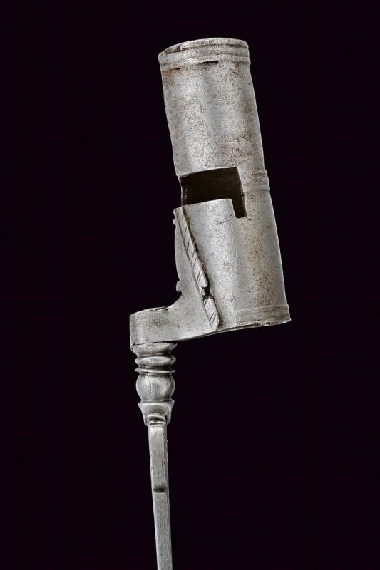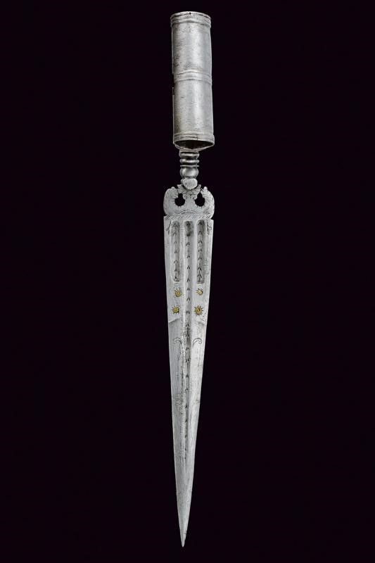 Italia meridionale, lunghezza 36.5 cm. Lama dritta a due fili, con base recante triplice scanalatura incisa; quella centrale si prolunga quasi fino al debole. Il lungo tallone inciso a motivi floreali, parzialmente traforato ed intagliato e decorato con quattro soli rimessi in ottone su entrambe le facce. Manicotto in ferro decorato ad anellature.