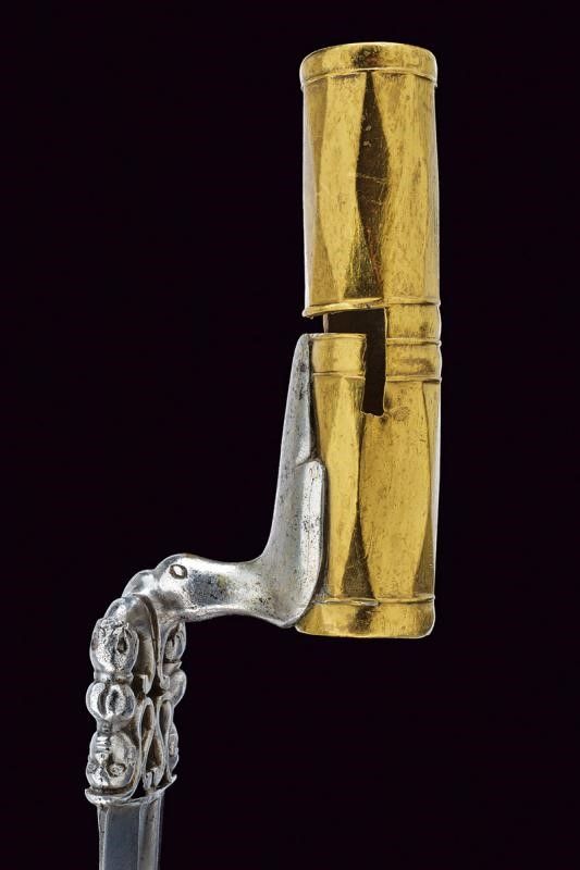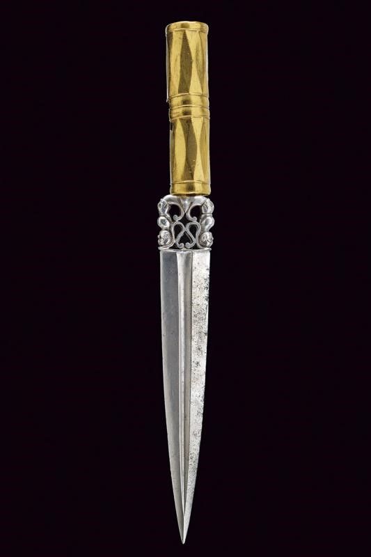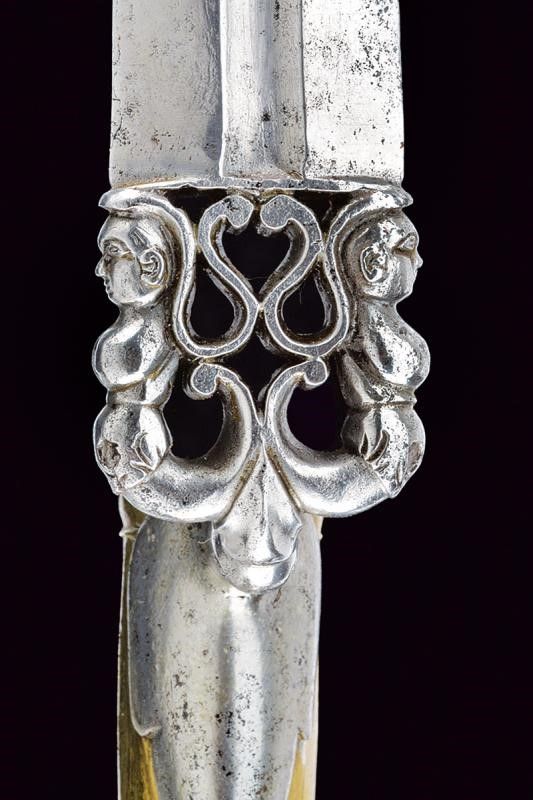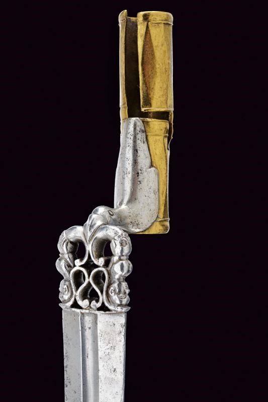 Italia meridionale, lunghezza 34.4 cm. Robusta lama dritta a due fili con profonda scanalatura centrale. Il tallone traforato con un cuore affiancato da due cariatidi scolpite quasi a tuttotondo. Il collo lavorato a testa d'aquila. Manicotto in ottone ornato a triangoli ed anellature. Rara.