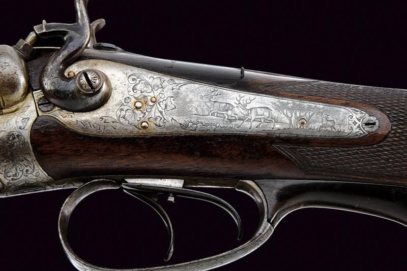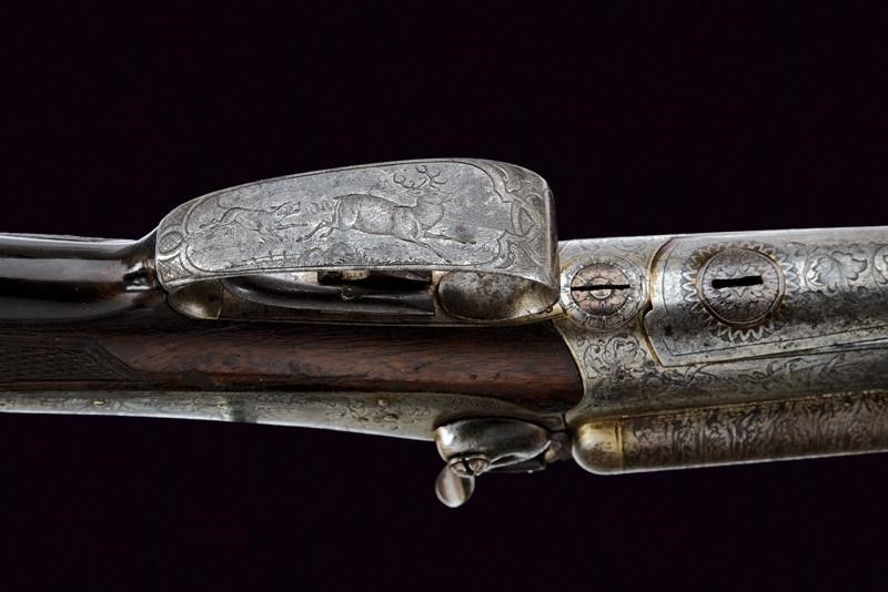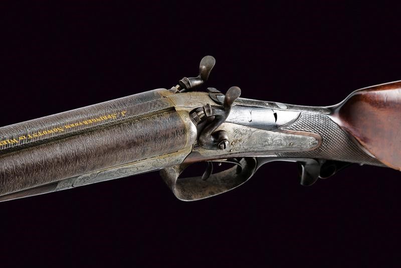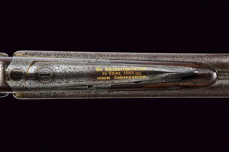 Vienna, lunghezza 104 cm. Canne tonde rigate (anime pulite, rigatura ben visibile), in fine damasco, con bindella firmata in oro 'J. SPRINGER VORM NOWOTNY IN WIEN' e dotata di alzo e mirino, cal. 15 mm. Lunga codetta incisa con cervo e a motivi floreali, munita di diottra abbattibile e recante piccolo scudetto ovale in argento. Batterie a molla indietro firmate 'SPRINGER ' e 'IN WIEN', incise finemente a temi venatori e a motivi floreali. Calcio (abrasioni, restauro attorno alla codetta) e astina in legno con collo zigrinato e fornimenti in ferro decorati en suite. La leva marcata in oro 'DIE BRIGADEEQUITATION ZU UDINE 1864/65 IHREM COMANDANTEN'. Matricola '23xx'. Grilletti con sensibilizzatore.