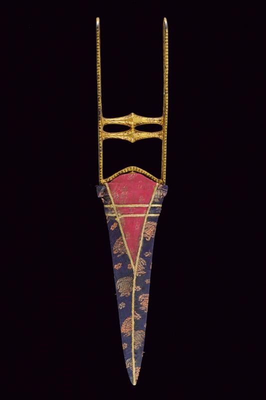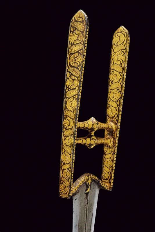 India, lunghezza 40.4 cm. Metà del XIX Secolo Snella lama in dritta in damasco, di forma triangolare a due fili e doppia scanalatura, nervata al centro, con punta rinforzata e costolata in mezzeria, dotata di base con fiore dorato. Fornimento di tipica foggia, i due traversini uniti al centro; tutta la superficie decorata in oro con eleganti disegni a motivi floreali e geometrici, la base dell'impugnatura con iscrizioni (piccole mancanze alle agemine). Fodero in legno ricoperto con tessuto policromo.