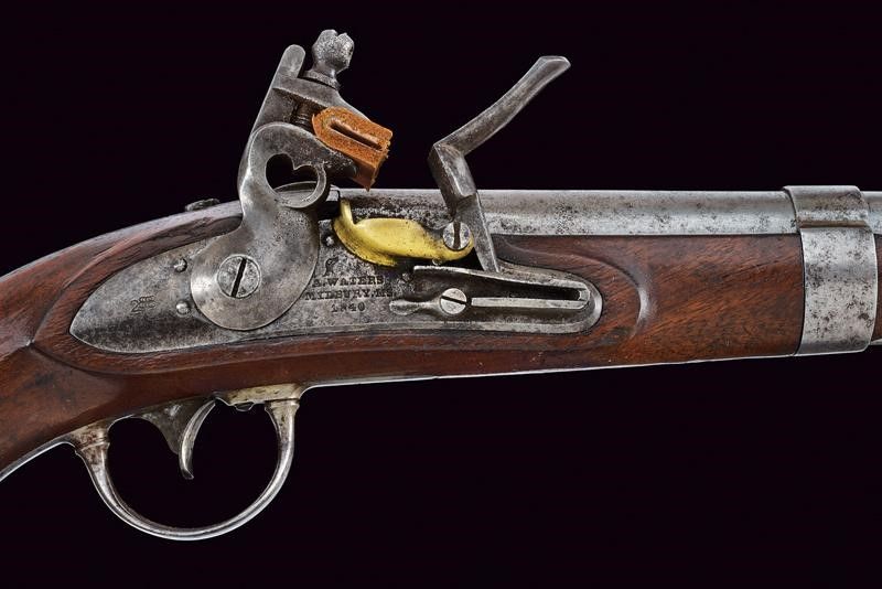 USA, lunghezza 35 cm. 1840 Canna tonda liscia con culatta punzonata 'US / LS / P'. In volata cal. 14,5 mm. (circa .57) lunga 8-1/2'. Mirino in ottone, codolo con traguardo a sella. Batteria marcata con emblema a testa d'aquila sormontante la dicitura 'A.WATERS / MILBURY MS' e con data '1840'. Scodellino in ottone. Meccanica ben funzionante. Cassa a tre quarti in legno con timbri d'ispezione militare sul fianco sinistro 'NWS' e 'MPL'. Fornimenti in ferro. Bacchetta a snodo. Intaccature.
