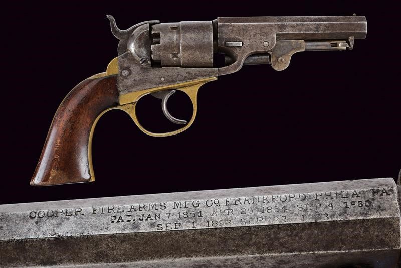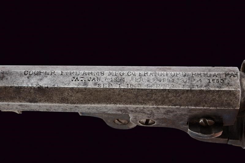 USA, lunghezza 22,5 cm. 1864 - 1869 Canna ottagonale rigata (interno da pulire, rigatura visibile), da 5', con mirino a cuspide in ottone e marcatura della ditta al dorso con brevetti, cal. 36. Tamburo a cinque colpi, con coda ribassata e matricola coeva al castello. Meccanica funzionante. Impugnatura in noce. Bande in ottone, sul fondo la matricola '84xx'. Qualche intaccatura. Alcuni piccoli punti con lievi tracce di finitura. Secondo modello.