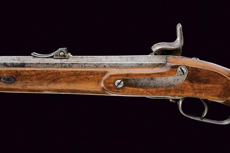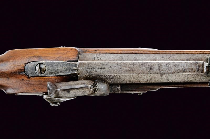Austria, lunghezza 110 cm. Canna ottagonale rigata, con volata tonda, firmata alla base '... KOLTHALLER' (?), marcata '431' e '1B'; dotata di alzo regolabile, dente d'innesto per baionetta e mirino. Cal. 14 mm. Batteria a molla in avanti datata '857' e con punzone dell'aquila imperiale. Cassa intera in legno (restauri). Fornimenti in ferro.