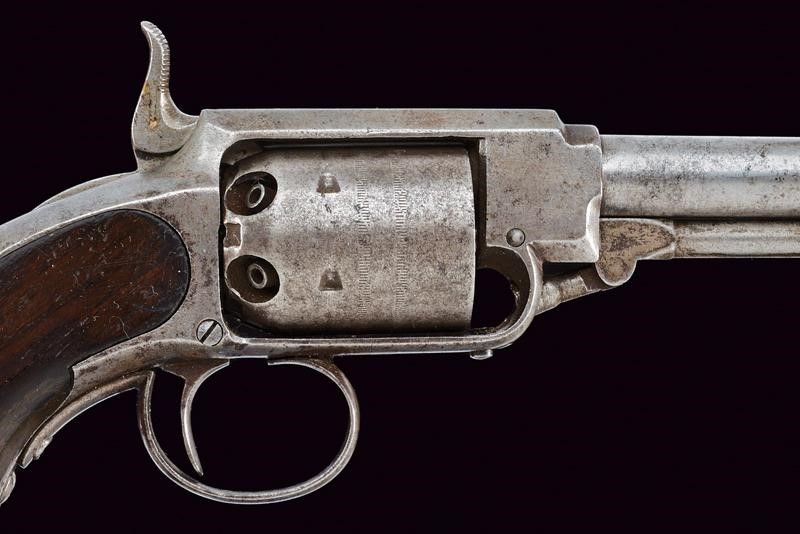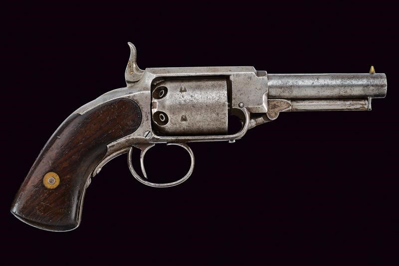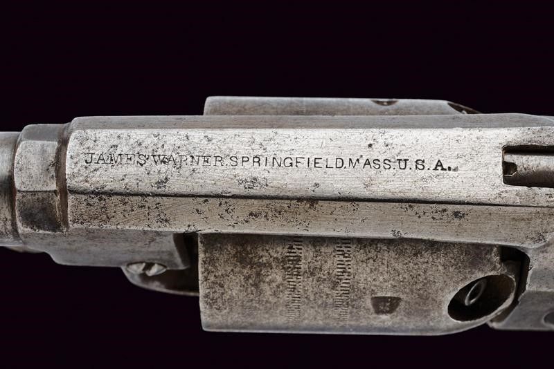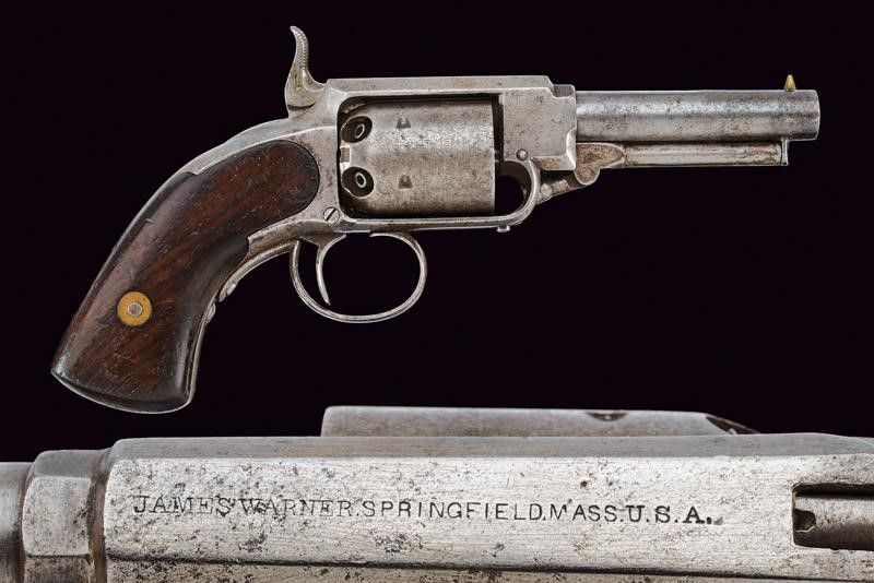 USA, lunghezza 19 cm. 1857 - 1869 circa Canna tonda rigata con mirino conico in ottone da 3' circa (anima pulita, rigatura visibile), cal. 28. Castello con dorso marcato 'JAMES WARNER SPRINGFIELD MASS. U.S.A.' Tamburo liscio a sei colpi. Meccanica funzionante, la rotazione non molto precisa. Guancette in noce. Qualche traccia forse di nichelatura sulla leva del calcatoio. La molla sul lato inferiore con resti di brunitura color blu. Un po' di intaccature. Anche la volata con resti di finitura color blu.