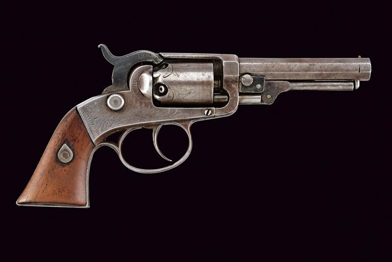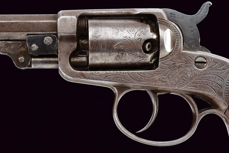 USA, lunghezza 22 cm. 1857 - 1859 Canna ottagonale da 3-3/4' con mirino conico in ottone (anima da pulire, rigatura visibile), cal. 28. Tamburo a sei colpi con incisioni a fiorami alla base. Castello in ferro anche questo con incisioni floreali. Il cane del tipo 'sidehammer' con resti di brunitura antica e con marcature 'ELLS PATENT / AUG 1 1854 APRIL 28 1857'. Meccanica funzionante solo in doppia azione. Numero '22' all'interno dell'impugnatura e su una guancetta. Guancette in legno. Piccoli punti con resti di brunitura color blu antica.