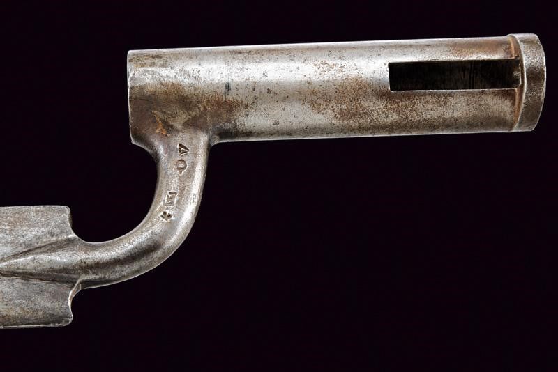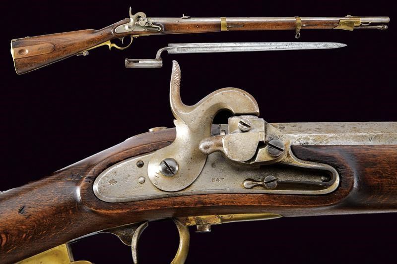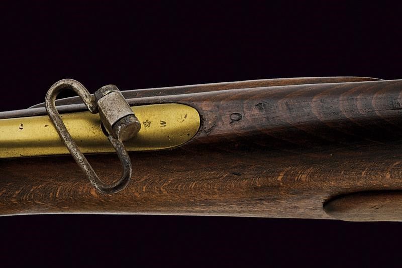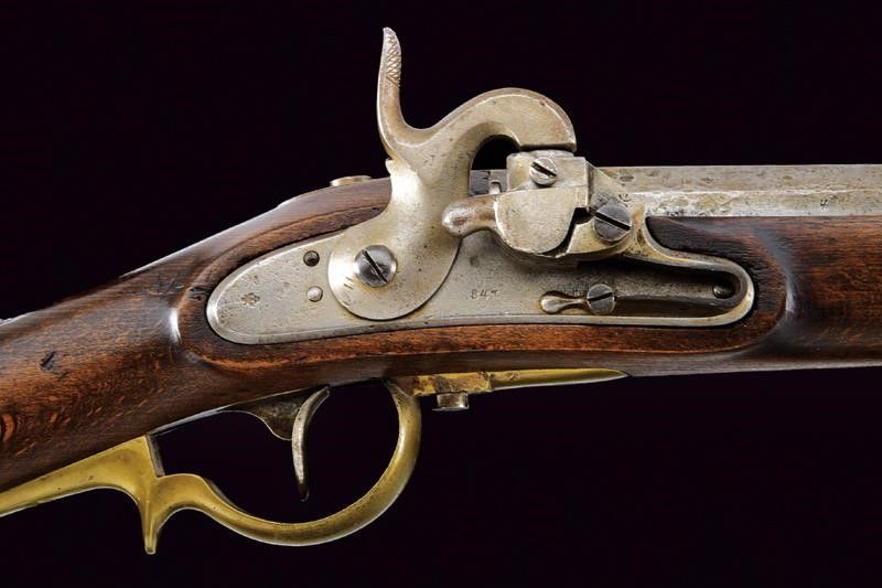 Canna tonda rigata, con culatta ottagonale (all'interno un po' di pitting soprattutto in volata, rigatura ben marcata per tutta la lunghezza), dotata di mirino e dente d'innesto per baionetta, con alzo a fogliette abbattibili, resti di punzoni quali 'V', '4' e un sole. Cal. 18,1 mm. in volata. Batteria con sistema Augustin, cartella datata '847' e recante punzone imperiale. Meccanica ben funzionante. Cassa intera in legno (rottura del collo ben restaurata in epoca d'uso) con resti di timbri. Fornimenti in ottone. Varie viti con punzoni '20'. Bocchino con gancio per baionetta. Bacchetta in ferro con battipalla munito di sforatura. Pala con patchbox (manca il dente di fissaggio). Con baionetta 'Haubajonett', lunghezza 72 [cm], recante marcature al collo '.F' 'W' e altri timbri.