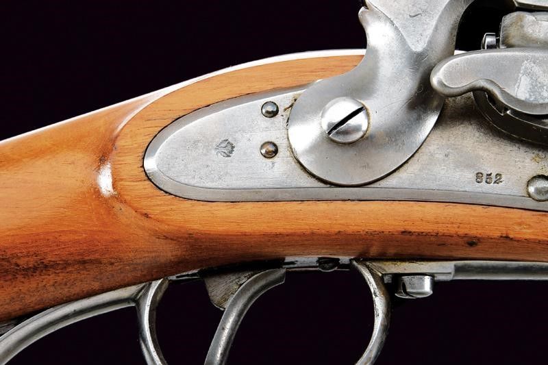 Austria, lunghezza 112.5 cm. Canna tonda con base ottagonale con bindella, l'anima dotata di dodici rigature, base marcata 'FERD. FRUWIRTH', alzo abbattibile con range da 150 a 700 piedi (circa 112 - 525 mm), mirino, cal. 18.1 mm. Batteria con sistema Augustin datata '852' e con punzone imperiale. Cassa intera in bel legno chiaro, sotto il calcio marcatura 'F.F. 1852'. Fornimenti e bacchetta originale in ferro. Molto raro.