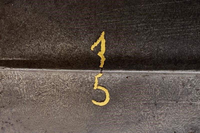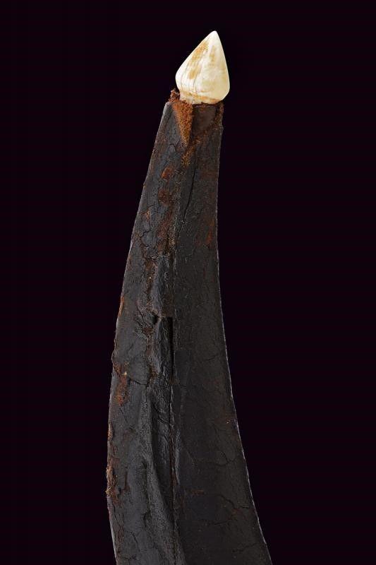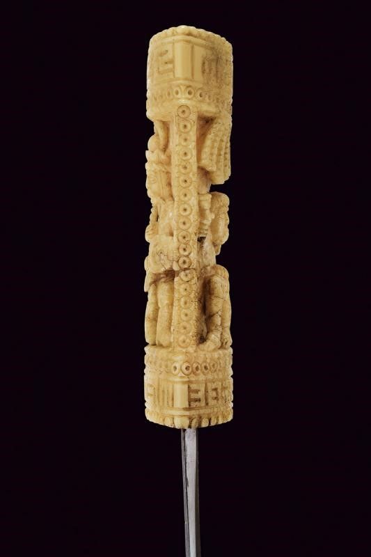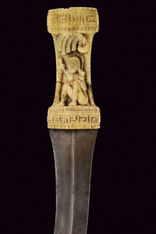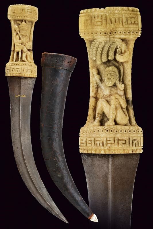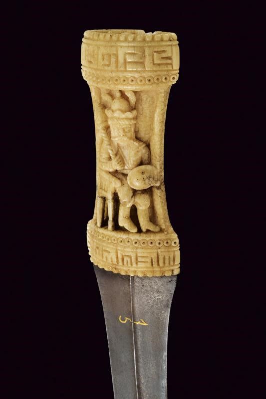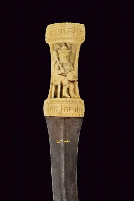 Persia, lunghezza 38 cm. Prima metà del XIX Secolo Lama curva a due fili con nervatura centrale, in damasco scuro (piccole zone con intaccature), recante una decorazione (o marcatura?) in oro alla base. Impugnatura in zanna di tricheco (rottura restaurata e piccole mancanze) profondamente scolpita, con effige di un personaggio importante, armato di scudo e mazza e seduto su una sedia su un lato, e una figura seduta sotto una palma sull'altra; le estremità con decorazioni geometriche. Fodero in legno rivestito di cuoio.