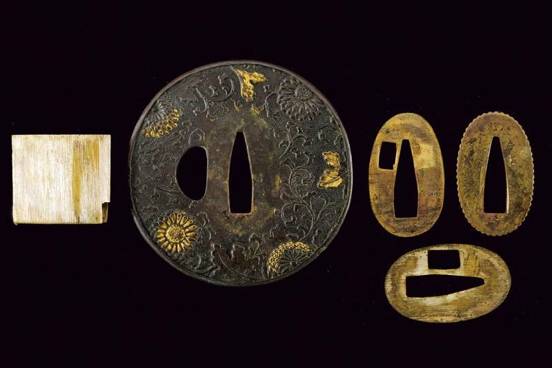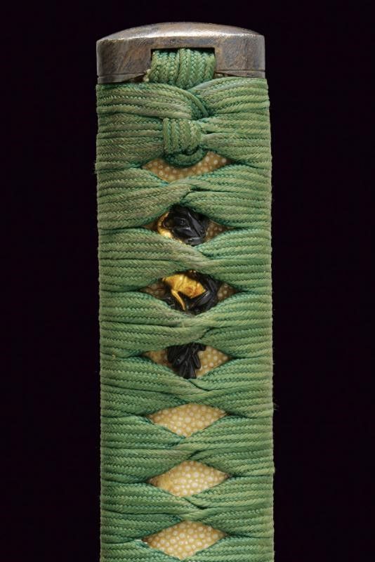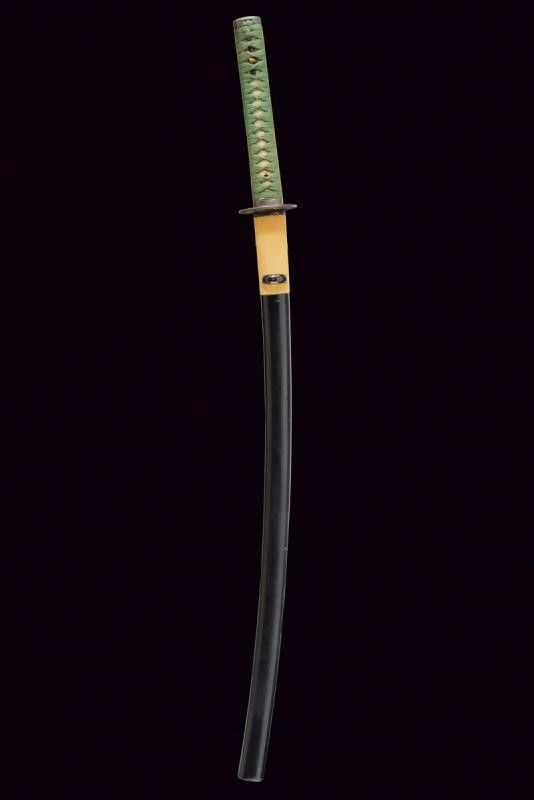 Giappone, lunghezza 92.4 cm. Periodo Showa (1926-1989) Nagasa (65.7 cm), hamon e hada visibili; habaki in ottone con resti di argentatura. Nakago mei 'Noshu Seki Maekawa Kane Tsugu Saku Kore', con un mekugi-ana. Koshirae con bella tsuba, fuchi-kashira di fattura semplice e fini menuki. Tsuka-ito in seta verde. Saya in legno laccato nero. Manca il perno del mekugi-ana. La lama Showa, 1930 circa, il koshirae del tardo Periodo Edo.