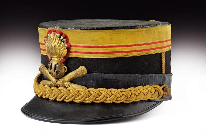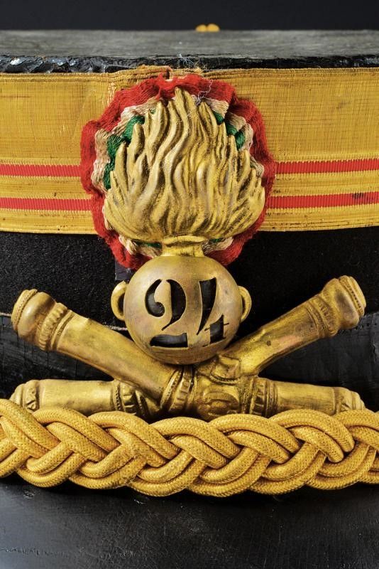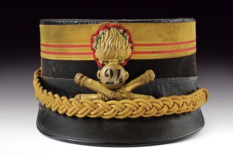 Regno d'Italia, altezza 12 cm. inizio del XX Sec. Fusto rigido rivestito di panno turchino, coccarda tricolore, fregio in ottone stampato con cannoni e granata a fiamma dritta. Bel cordone in tubolare sempre dorato. Interno con alluda in marocchino nero e cuffia in cotone plissettato.