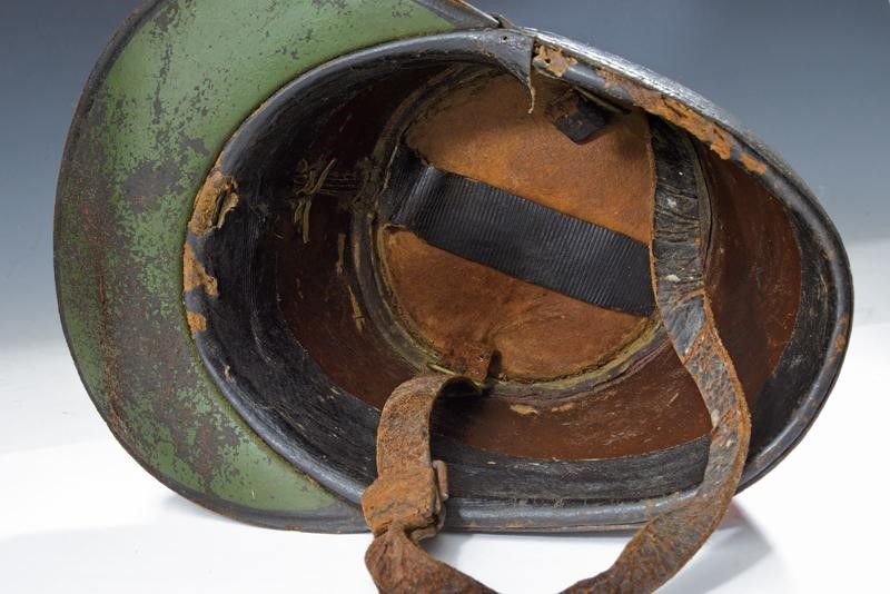 Regno d'Italia, altezza 16 cm. 1860 Fusto in cuoio ricoperto da panno scarlatto, cappio e numero ' 23' in metallo argentato, nappina tonda in lana, coccarda metallica tricolore. Interno della visiera dipinto in verde, alluda in coietto nero, completo di soggolo originale in cuoio. Esemplare raro in buone condizioni.