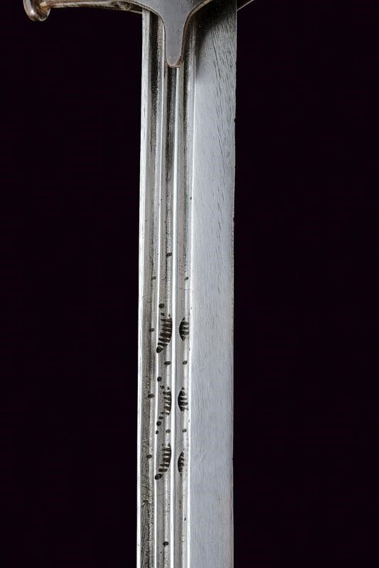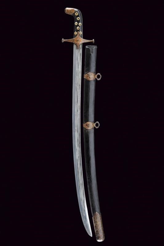 Impero Ottomano, lunghezza 91 cm. Prima metà del XIX Secolo Lama di media larghezza, leggermente curva, a un filo e controfilo e con triplice scanalatura sotto al dorso. Sul lato di quarta alcune incisioni dentate alla base. Fornimenti in ferro con elso a croce inciso e dorato (finitura rinfrescata) con una tigre fra decori floreali; il pomo angolato inciso a fiorame. Impugnatura rivestita di cuoio con rivetti in ottone decorati con puntini in argento. Fodero in legno rivestito di cuoio (di restauro, moderno) con fornimenti in ferro decorati en suite. Due anelli di sospensione.