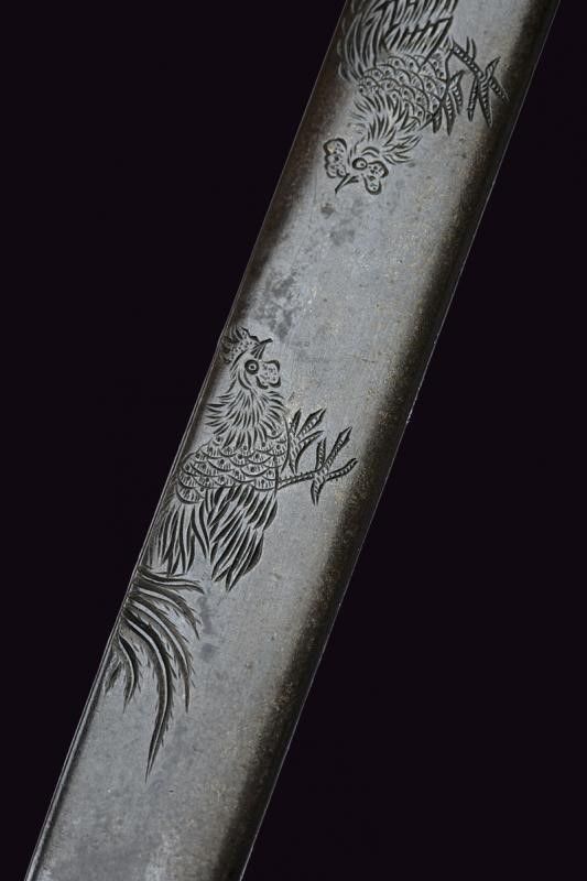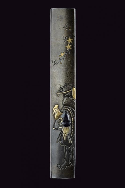 Periodo Edo (1603-1867) In shibuichi, finemente lavorato con decorazioni in shakudo e oro, i dettagli lavorati a cesello. Sulla parte anteriore raffigurato un saggio con un gallo nella mano intento ad osservare le stelle sotto i rami di un albero. Sul retro presenti decorazioni cesellate raffiguranti due galli e la firma. Periodo Edo, 1800 circa. In kiri-box.