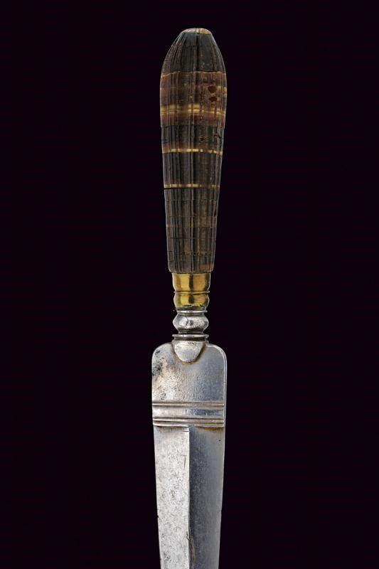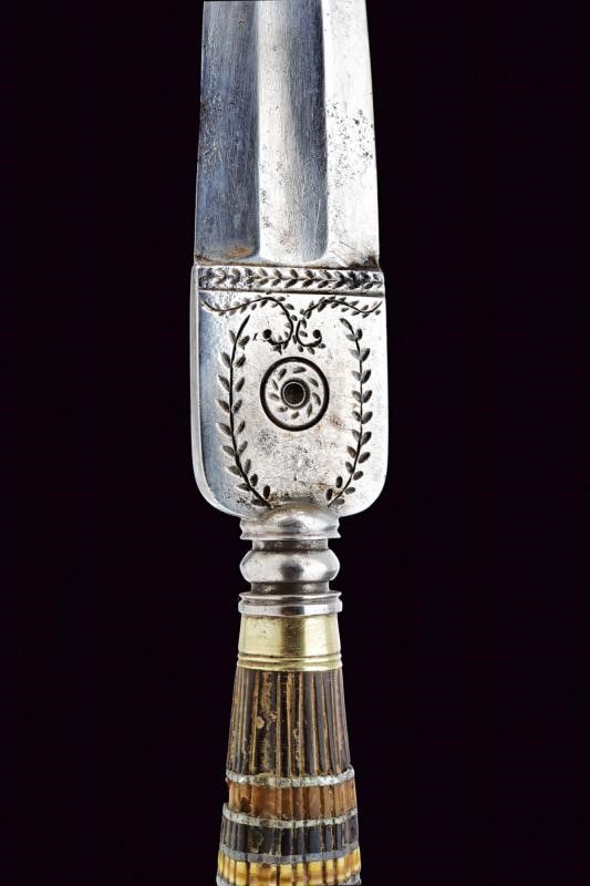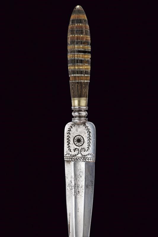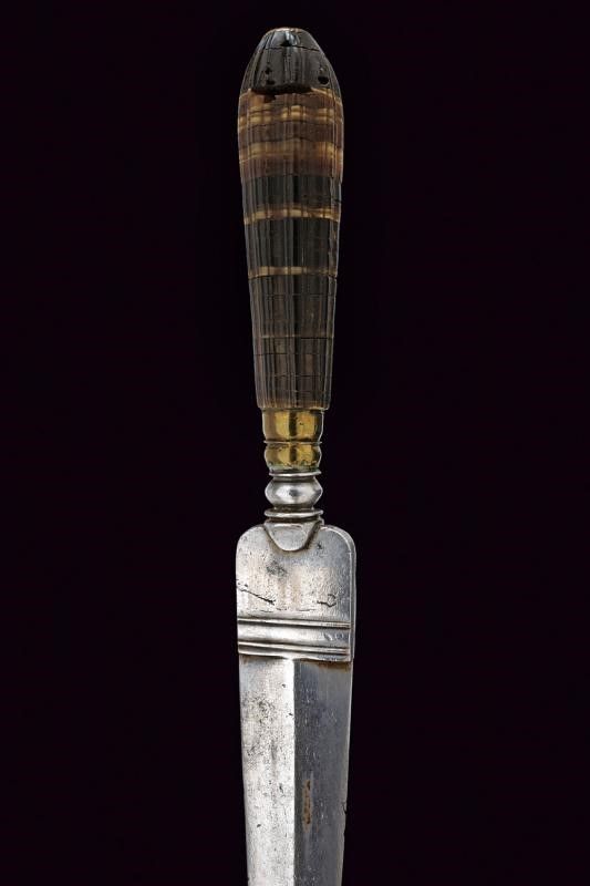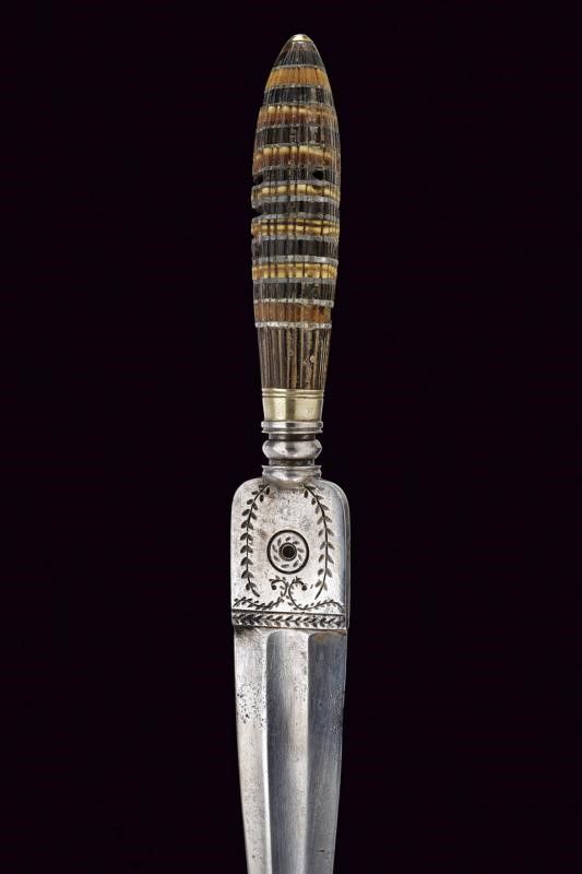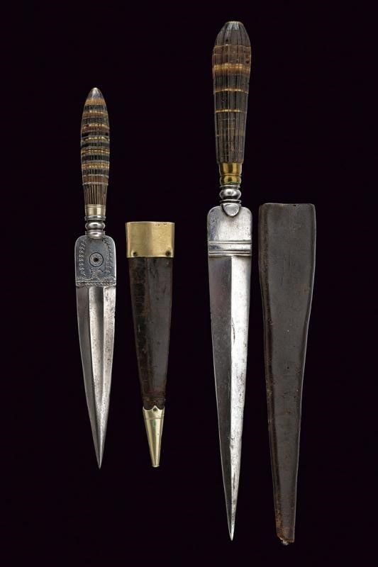 Italia meridionale, lunghezza 23.1 - 32 cm. Uno con lama dritta a due fili con sguscio centrale e tallone inciso a motivi floreali. L'altro con lama a due fili costolata in mezzeria. Entrambi con impugnatura in corno a dischi (mancanze). Quello di lunghezza inferiore dotato di fodero con fornimenti in metallo bianco, l'altro in semplice cuoio senza fornimenti.