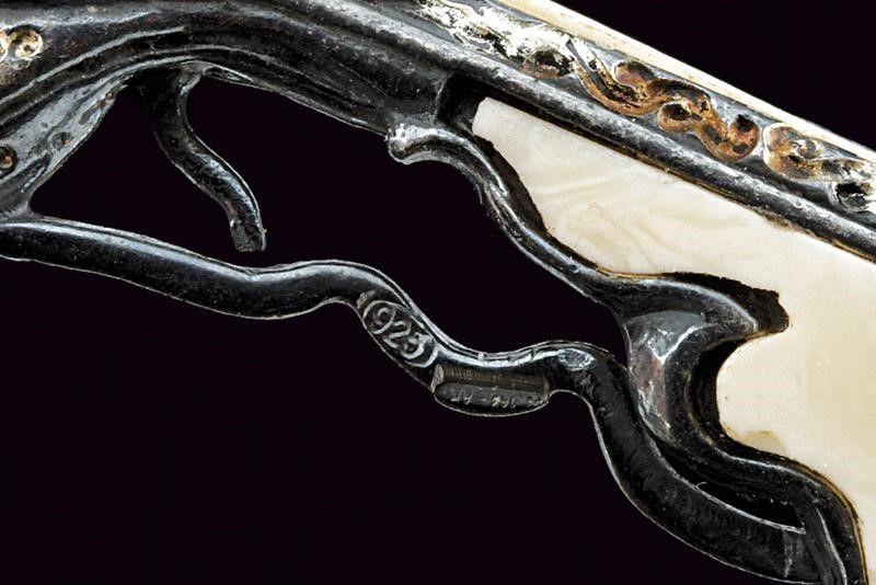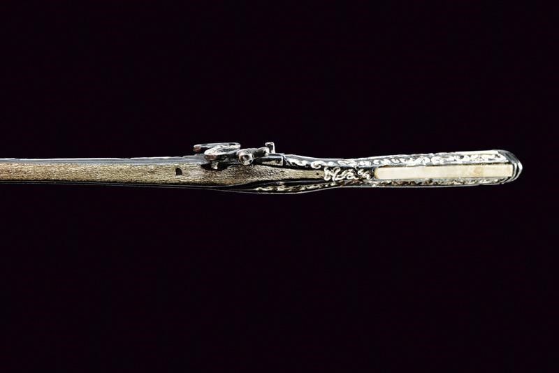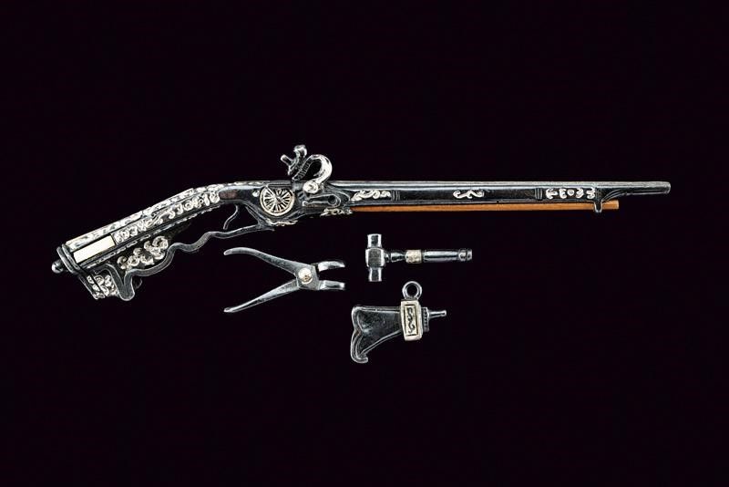 Fucile a ruota, con punzone '925', 'AR' e tarsie in resina laccata. Simulacro d'arma non funzionante. Insieme a una fiasca da polvere, fondipalle e una chiave a ruota, tutti in argento brunito.