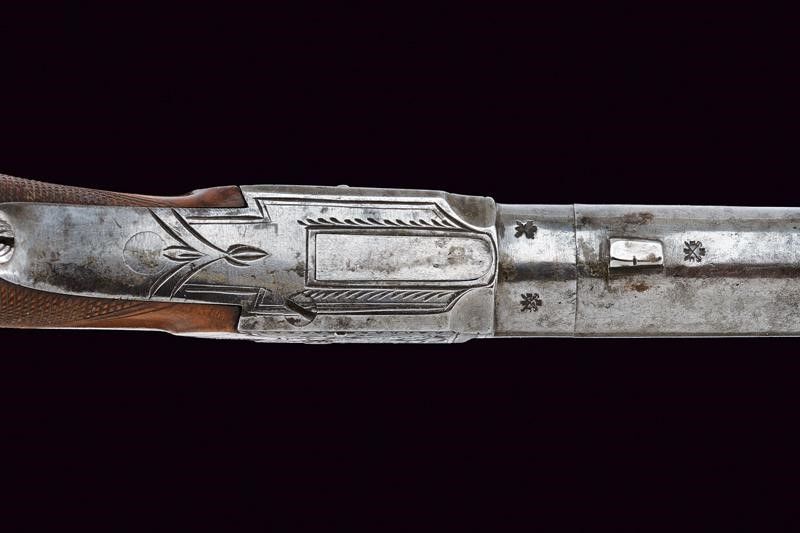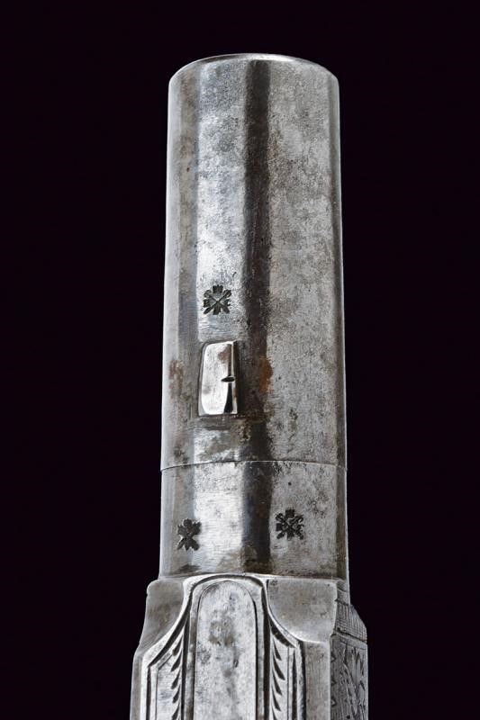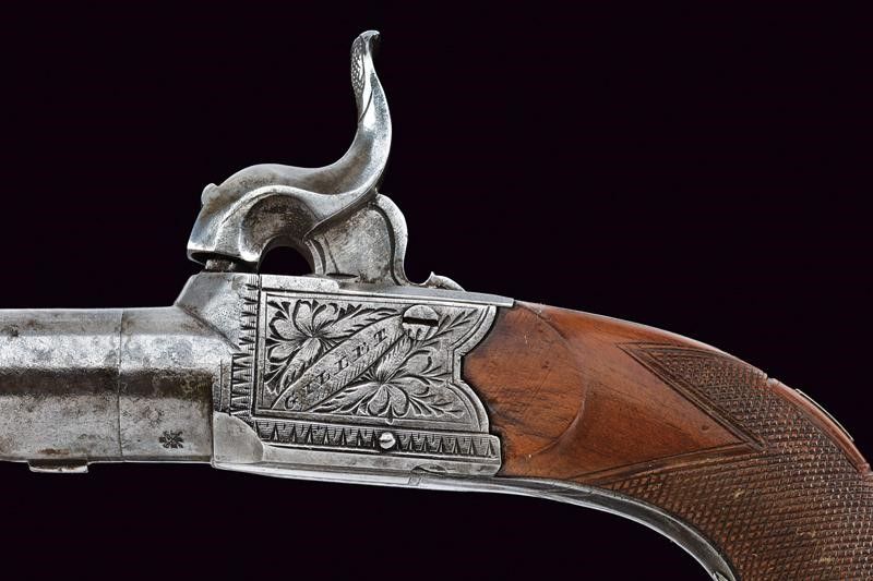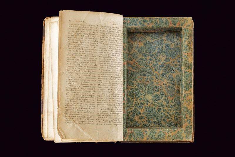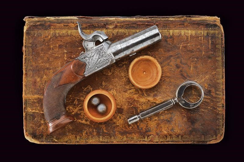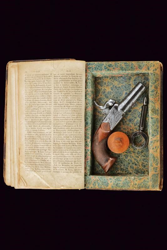 Bristol, lunghezza 15 cm. Canna cilindrica, rigata e svitabile, recante alla base tre punzoni del banco di prova di Birmingham , cal. 11 mm. Castello in ferro di tipo box-lock firmato 'GILLET' e 'BRISTOL' fra incisioni a racemi, grilletto a scomparsa, meccanica funzionante. Calcio in legno micro-zigrinato con scudetto rettangolare in argento sul dorso. In una curiosa custodia realizzata con un libro antico. Con pagine incollate e scavate in modo da ottenere uno scomparto interno per la pistola. All'interno anche la chiave per svitare la canna e il luminello.