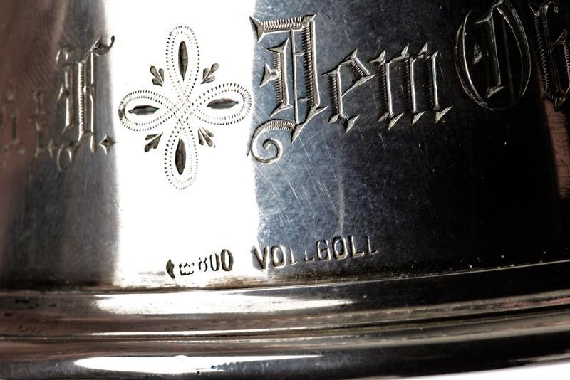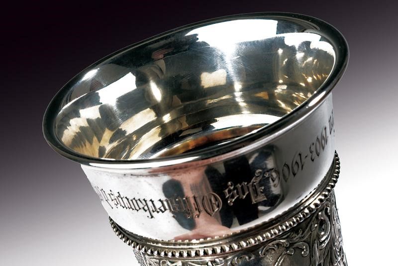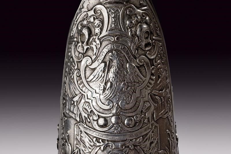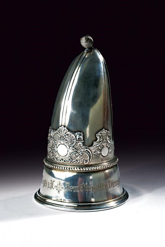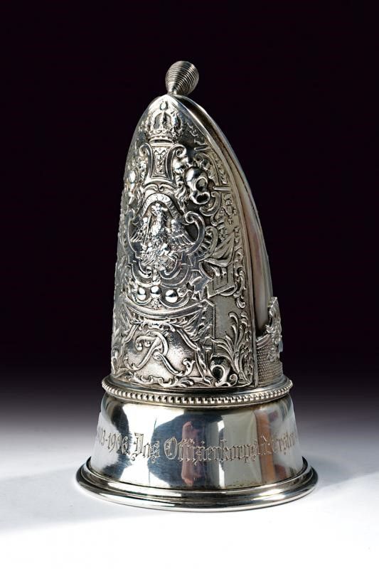 Prussia, altezza 13.8 cm. 1906 Bellissima ed esatta riproduzione in argento del copricapo. La base di forma svasata, recante l'iscrizione 'Dem Oberstlt. v. Diringshofen 1903-1906. Das Offizierkorps d. Ersten Garde Regts. z. F.', con marca a mezzaluna, corona, '800' e la parola 'VOLLGOLD'. Molto rara.