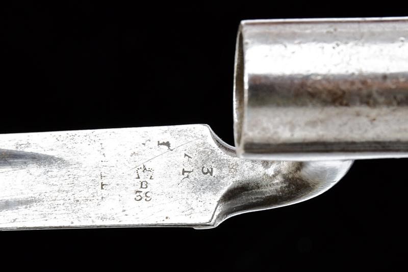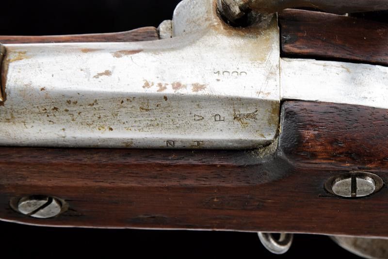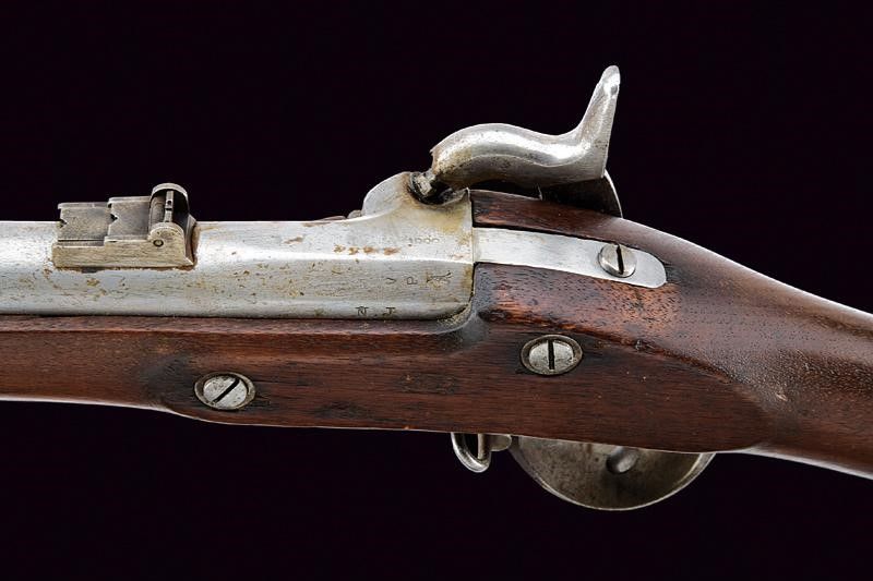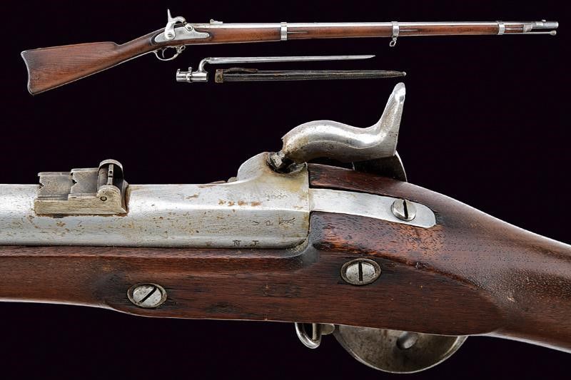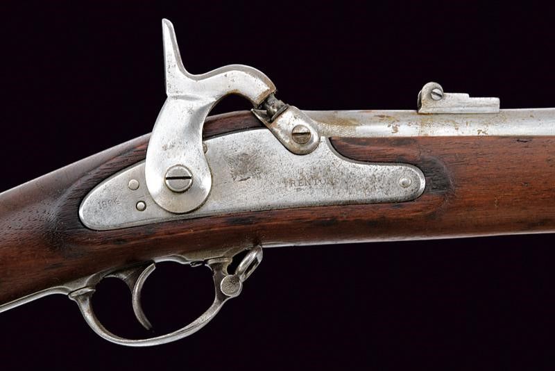 1864 Canna tonda, rigata, con culatta ottagonale recante punzoni 'N.J', 'V', 'P' e data non del tutto leggibile, alzo abbattibile a due regolazioni, mirino, cal. 14 mm. Batteria a molla in avanti con cartella piatta marcata al centro 'U.S. / TRENTON' e con aquila, codetta con data '1864'. Meccanica funzionate. Cassa intera in legno (piccolo restauro al calcio) con fornimenti e bacchetta in ferro. Calciolo marcato 'U S'. Completo della sua baionetta (lunghezza: 51.2 [cm]) con lama di sezione triangolare e con punzoni alla base, munita di fodero in cuoio con puntale a bottone in ferro.