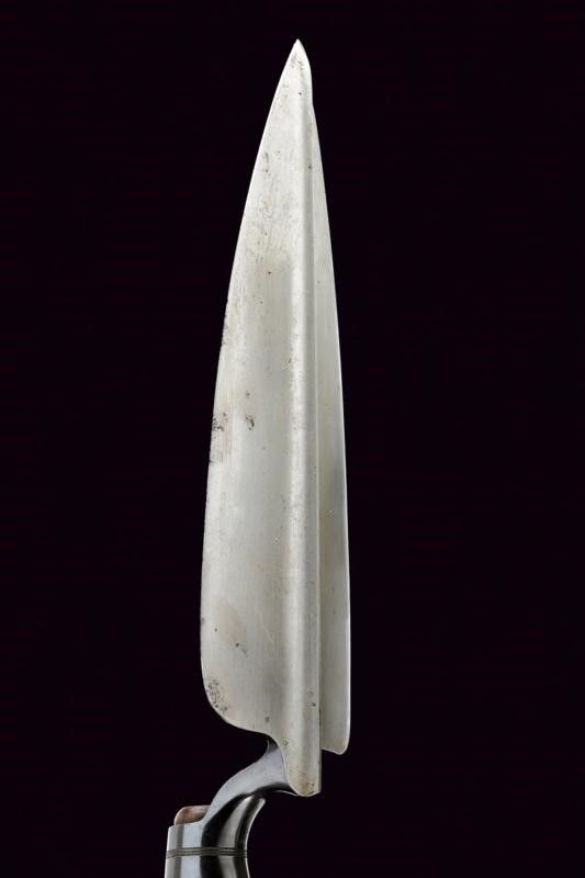 USA, lunghezza 40 cm. ultimo quarto del XIX Sec. Lama dritta, con dorso nervato. Manicotto in ferro brunito con marcatura del brevetto. All'interno impugnatura in legno. Fodero in cuoio (di restauro?) con fornimenti in ottone. Passante con placca marcata 'US'.