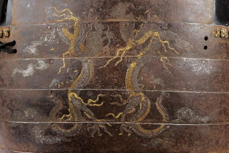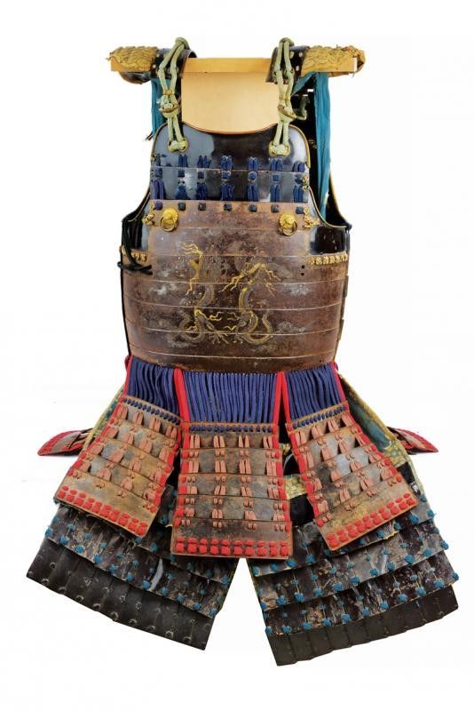Periodo Edo (1603-1867) In ferro, recante sul petto un dragone rimesso in argento e oro, Kusazuri con allacciatura moderna, Haidate con lamelle a lacca nera. Supporto non incluso.