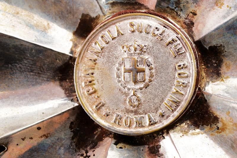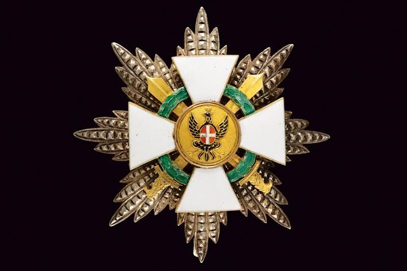 1942 - 1945 Placca dell'ordine con spade, a otto punte in argento con centro smaltato e dorato. Sul retro spilla verticale e firma del gioielliere 'D. Cravanzola Succ.i F.lli Borani Roma'.