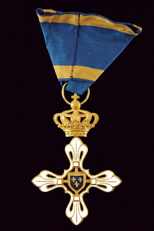 Ducato di Parma e Piacenza, dimensioni 4.6 x 4.5 cm. Seconda metà del XIX Secolo Croce di cavaliere di prima classe con corona, in argento dorato e smaltato, piccolissimo chip sul retro nel braccio superiore. Con nastro originale in astuccio nero, marcato in oro 'P. C.' Molto raro.